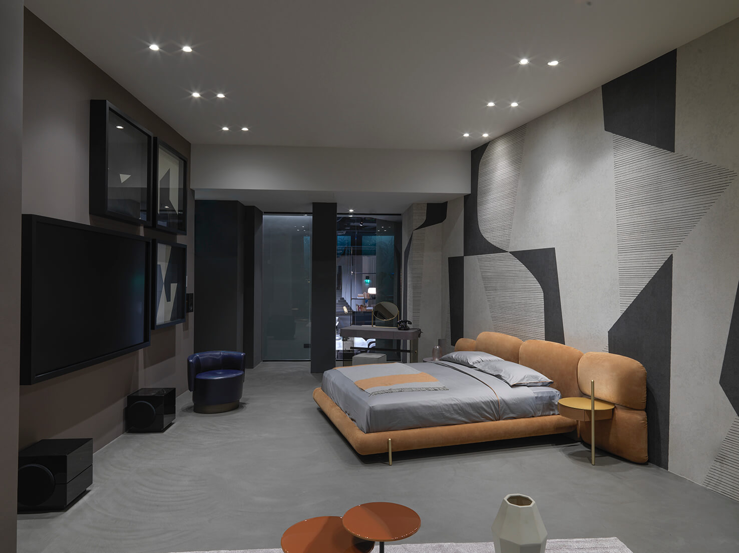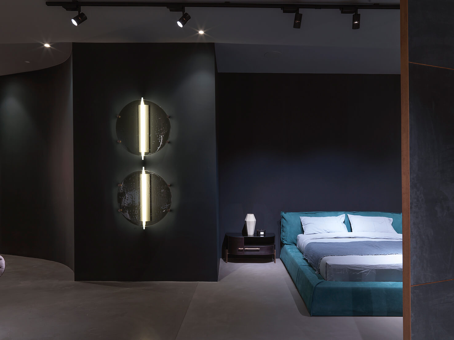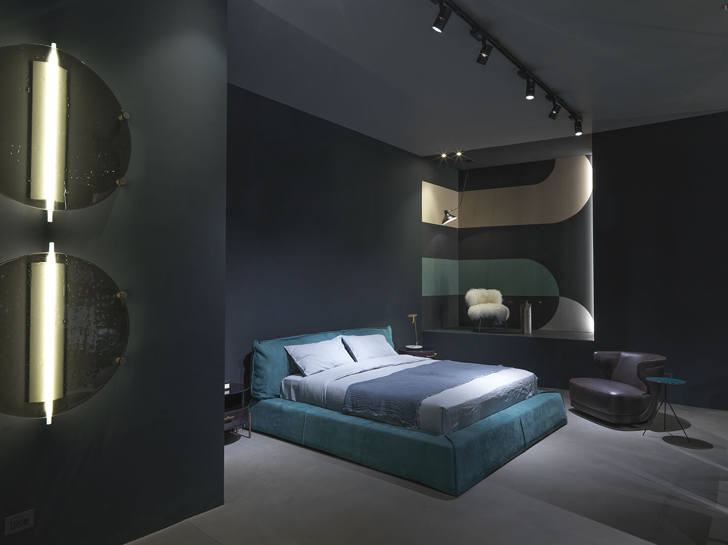 Among the new proposals in the showroom stand out the Stone modular bed whose peculiarity consists in offering two proposals for the associated bedside tables: one freestanding and one integrated with adjoining courtesy light.