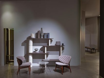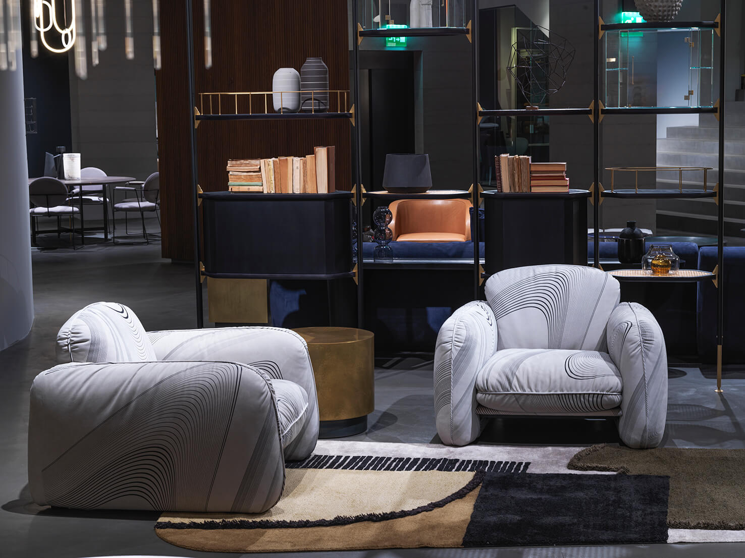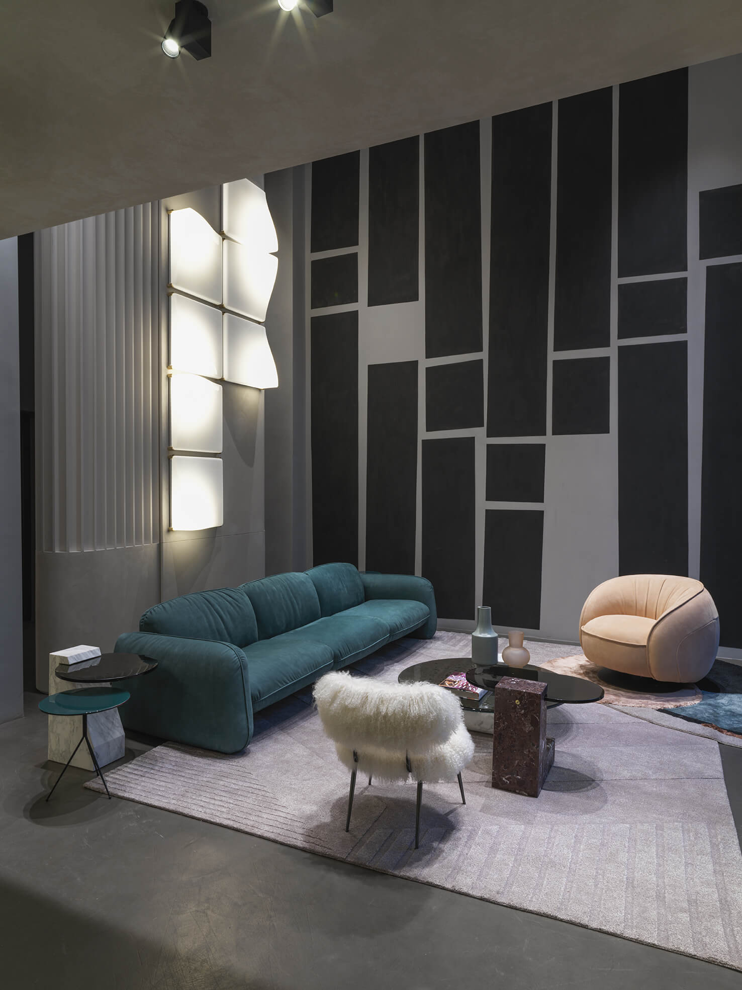 Among the upholstered items, the Brigitte sofa and armchair, the Leon armchair and the Milano collection stand out. The compositional possibilities of the Piaf modular sofa are also extended, whose full lines combine to create a piece of furniture of extreme refinement. Last but not least, the Lazy Bones armchair stands out for the skilful combination of geometries and soft fabrics, in a contrast of rare compositional taste.