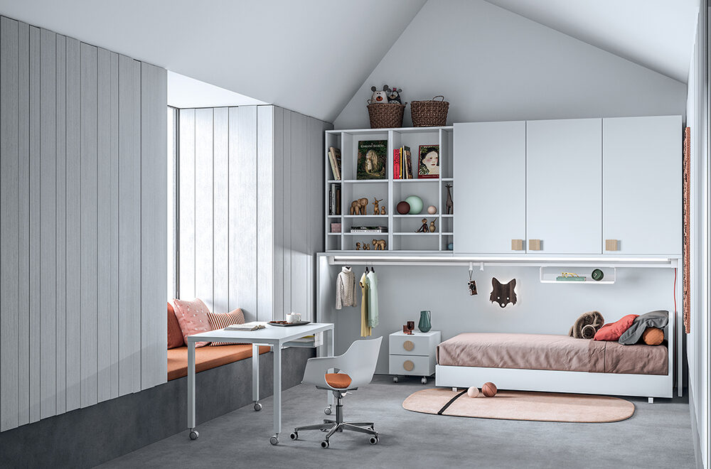 The introduction of walkways, pull-out beds and ladders that can be transformed into bedside tables marks the final transformation of the room in “Barca” where the main goal is the perfect use of the spaces and sizes, perfect to adapt to new housing needs.