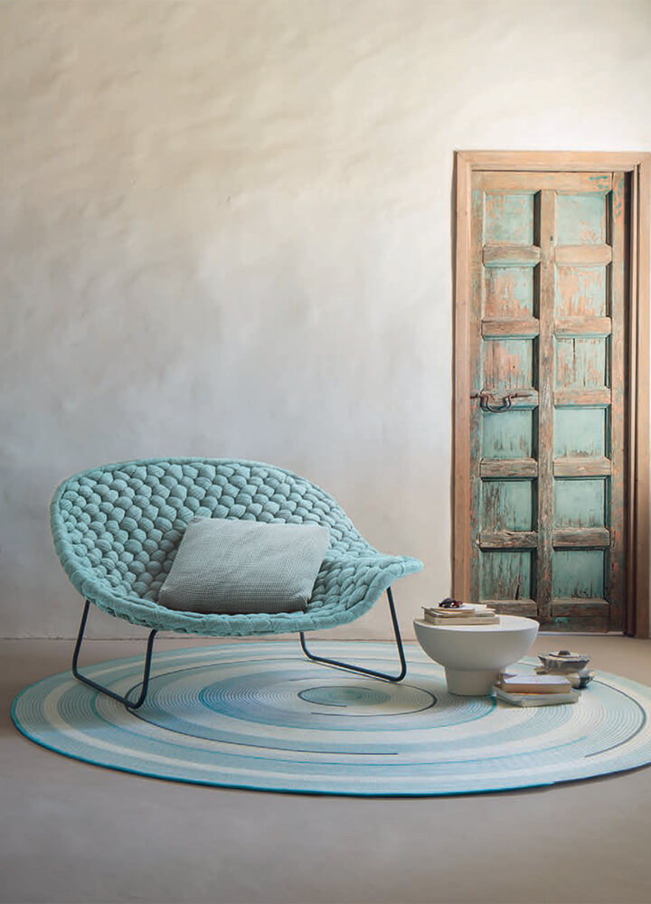 Also known and appreciated are the indoor and outdoor rugs, made in an infinite variety of shapes and with the most different materials, but always made unique by the sartorial touch of the company. More recent are the collections designed for interiors, characterized by modern and comfortable upholstered furniture, covered in many exclusive fabrics. Many products of Paola Lenti have won international awards, including the Red Dot Design Award and the German Design Award.