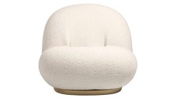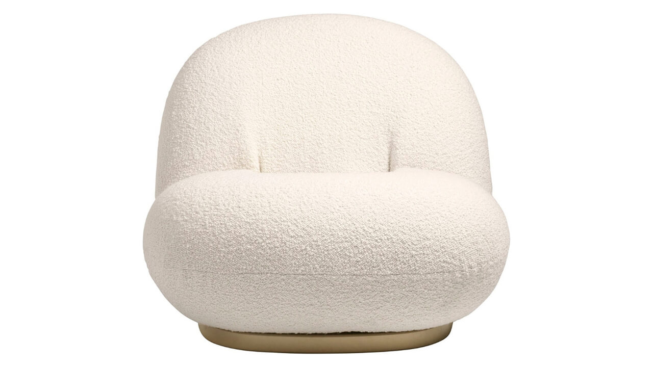 The armchair has no legs and it rests only on a base slightly raised from the floor, available in dark or golden finish, swivel with return movement or fixed. The choice of fabric strongly connotes the look and feel of the armchair: presented in white it takes on the appearance of a white snowflake, while the patterns of the Pierre Frey fabric collection give it a more eclectic and decisive appearance.
