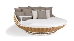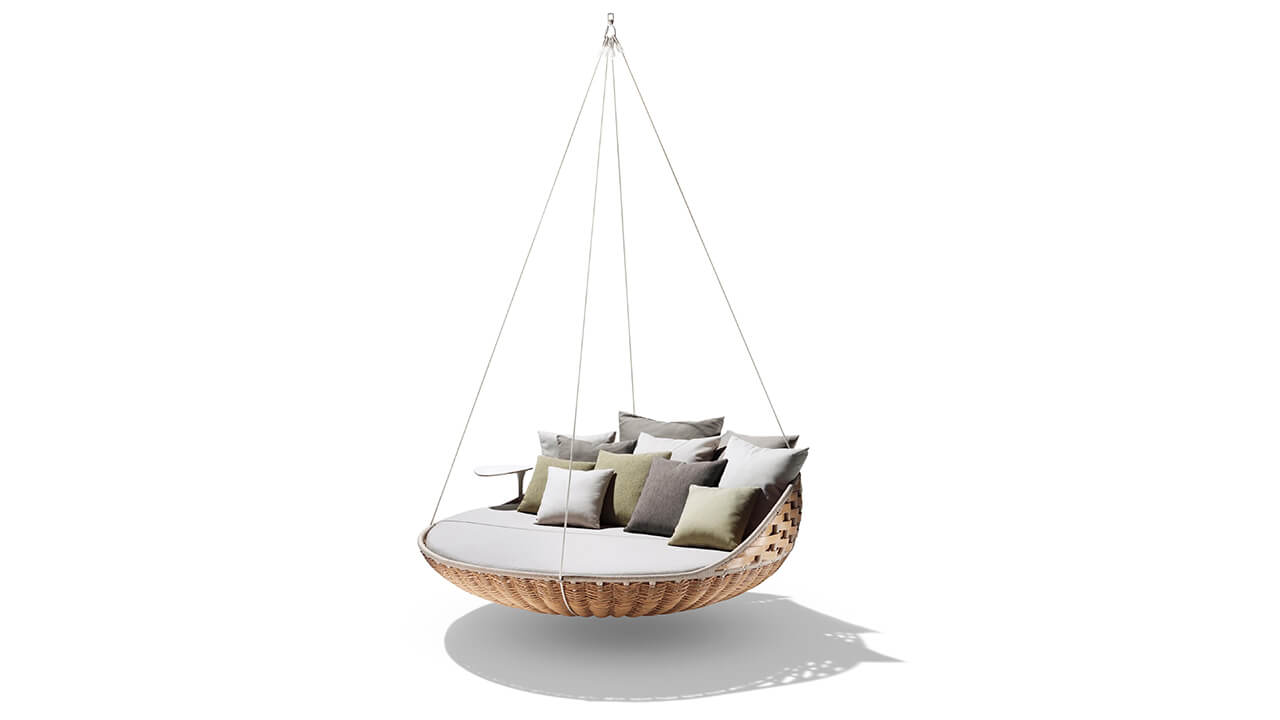 The basic idea recalls another big success of Pouzet for Dedon, the suspended daybed Nestrest, in the workmanship of the base that remembers a basket. Compared to that, however, it is even more spacious and welcoming, and it is also equipped with a practical rotating table with Corian top. The Swingrest Hanging Lounger can also be completed with a canopy that makes the seat more close and sheltered.