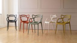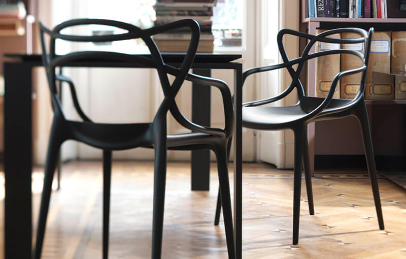 The Mastsers chair by Kartell is contemporaneously a tribute to the great masters of the past and and witty combinatorial post- modern game. Philippe Starck, who designed it in 2010 in collaboration with Eugeni Quitllet, has in fact created its back by composing together the silhouettes of three big masterpieces from the 1950s.