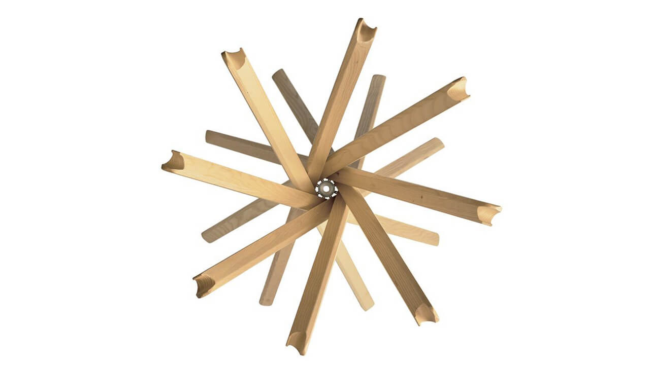 Sciangai can be closed, with the eight slats which form a compact vertical beam and which, when released, see their fall movement stopped by the eight-way joint positioned just above the middle of the axes. In this way the ground support surface is slightly wider than the upper crown, ensuring greater stability.