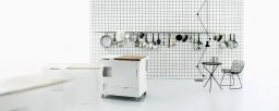 Minikitchen is now made up of a free-standing structure in white Corian (unlike the original project, which was made of wood), equipped with various storage units, doors and chests of drawers to hold pots, dishes and a small refrigerator. On the top there is an electric cooking plate and when the kitchen is closed it is hidden and protected by a Corian element used as a tray, and an iroko wood cutting board element that has inside a removable tray.