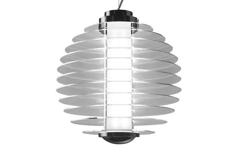 The 0024 lamp plays with the transparent effect, composing the shape of a sphere through eleven thin disks in tempered glass with different diameters, which make it at the same time immaterial and voluminous depending on the chosen observation point. This abstract geometry is compensated by the solid vertical volume of the diffuser, placed in the center of the disks and realized in satin glass to give the light a suggestive effect.