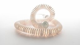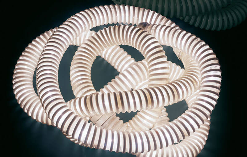 Made in 1969 with a translucent PVC tube for industrial use lined internally with metal rings, in each section Boalum has four housings for as many low voltage bulbs. PVC, a soft and foldable plastic film, had been developed already in the 1930s, originally used for the insulation of cables and electrical wires. In the 1960s it became almost omnipresent, especially in inflatable furniture.