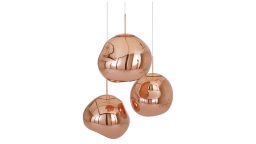 The lamp is available in four different colors: two with a warmer light, in copper or gold finish, and two with an extremely cold appearance, in black smoke and chrome finishes. Melt can be declined in various versions: the Melt and Melt Mini suspension lamps, which obtain a highly scenographic effect when connected in a group to a single rose, are also available in a led version, in the same way as the Melt Surface wall lamp.