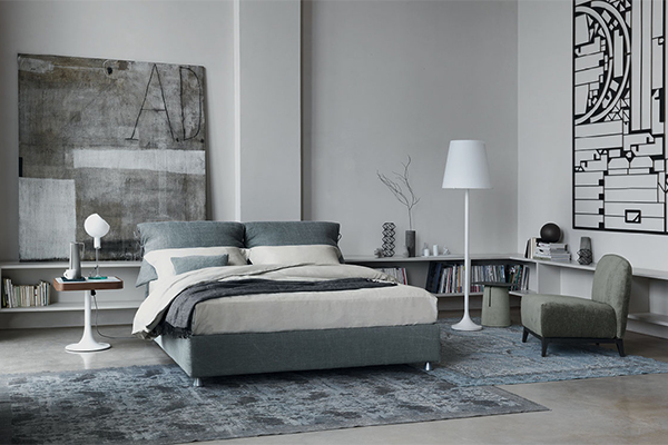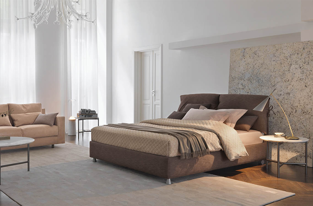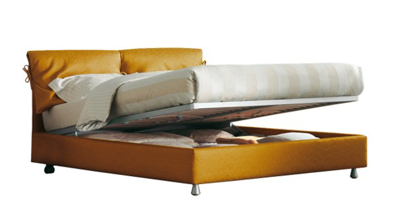 The cushion-covers of the headboard allow the pillows to be stored and protected from dust. Available with rigid base, box -spring base Comfort, storage base, fixed base h 25 cm. or h 16 cm. and with electrical movements.