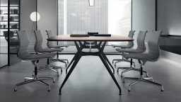 The Manta table system features an exclusive aluminum structure with three, four or six legs, available in round and softly modeled tops, which are in turn available in an exceptional variety of finishes. From lacquered or transparent glass to heat-treated oak, up to acrylic, the possibilities are varied. The high pressure die-cast aluminum structure combined with the central tie rod made of tempered aluminum alloy ensure maximum stability and resistance with minimum thickness profiles.