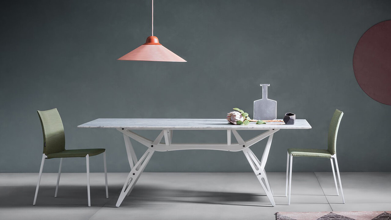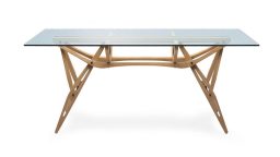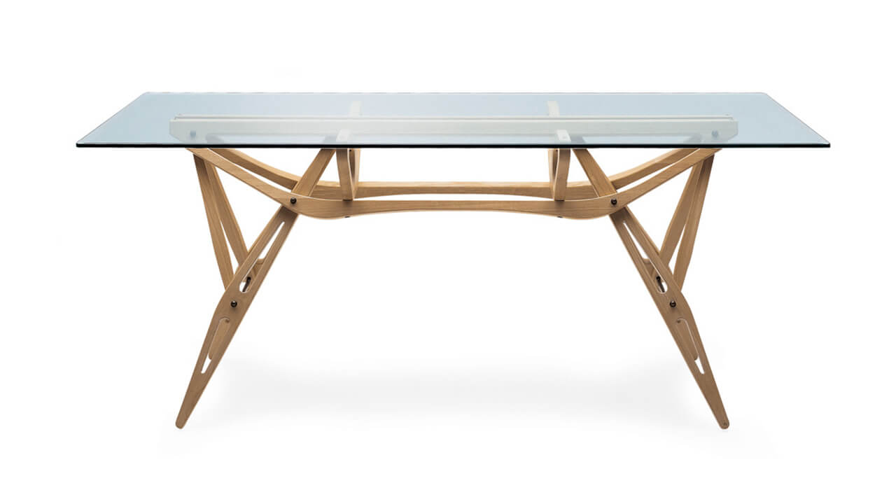 The Reale table by Zanotta is one of the most fascinating projects of the Turinese architect and designer Carlo Molino. His appeal lies in the base, from the complex structure at the same time geometrical and organic, revealed in all its beauty to the top in glass. An articulated symmetry of flexible wooden crosspiece, compact and transparent, in which every element fits together with the others with precision.