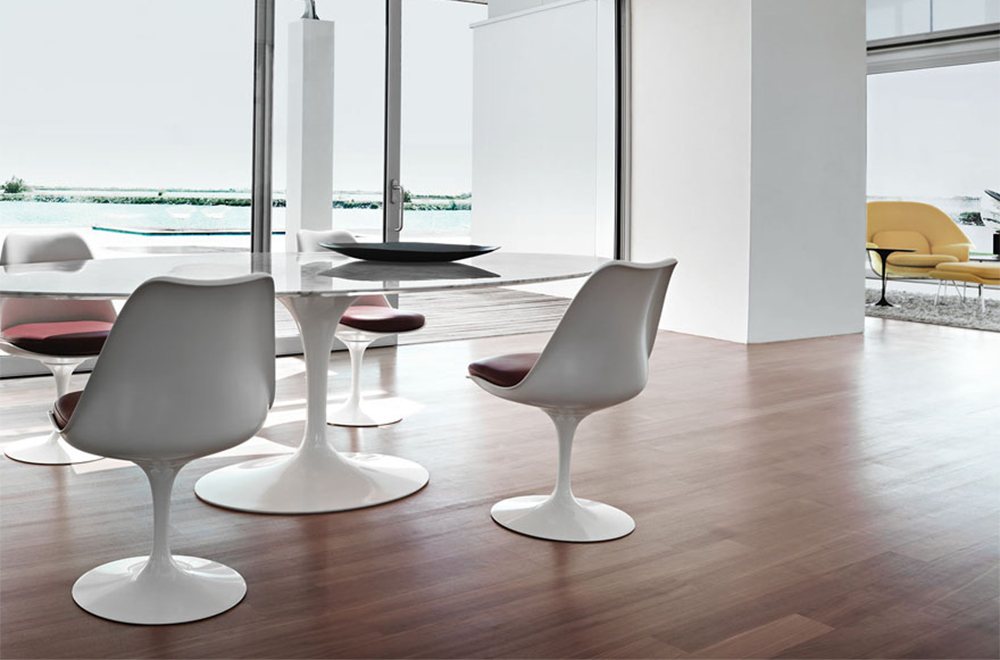 The attempt to bring simplicity and order to the pedestals was always a hot topic of the research of the famous finnish architect. Until then, the pedestals were always been overlooked by designers, with the results of making them confusing and uncomfortable for the tangled legs of tables and chairs. The attempt of Saarinen culminated in the presentation of the Pedestal series for Knoll in 1958, in which the Tulip chair was the flagship of a collection that included the elegant table today re-named “Saarinen”.