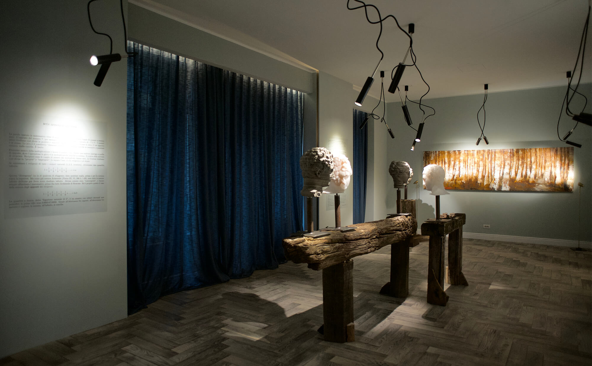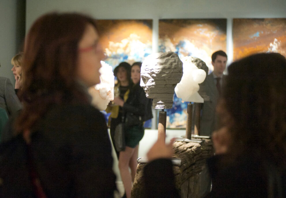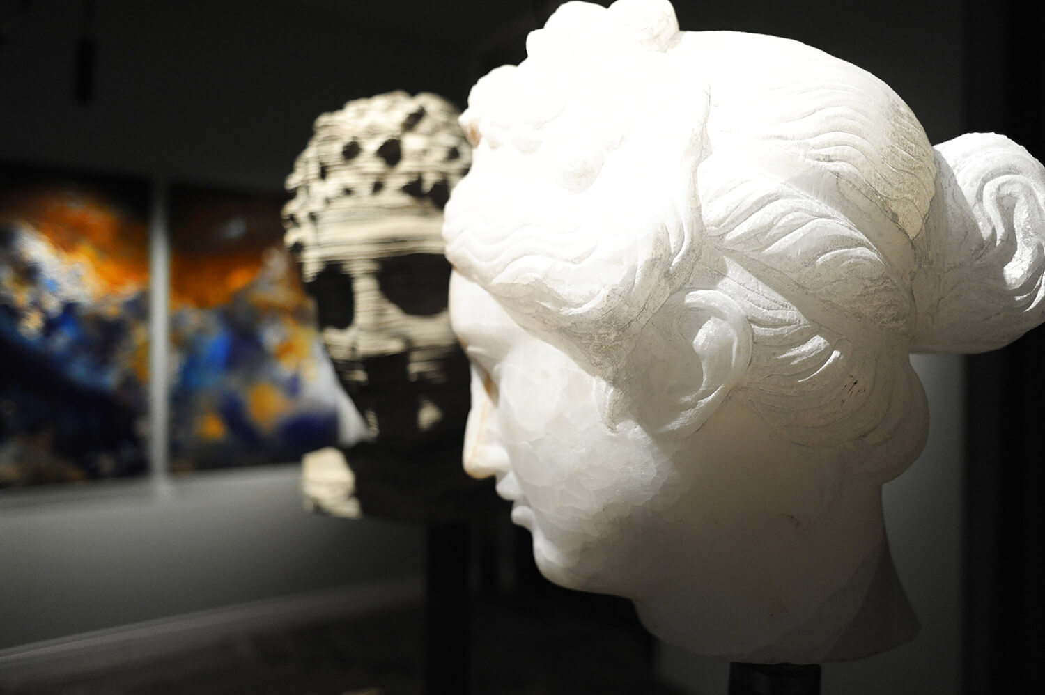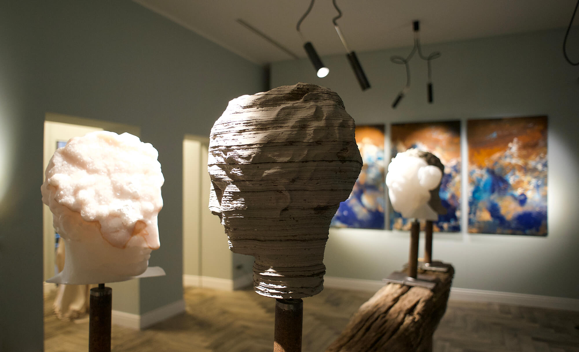 Starting from this concept, the two artists have collaborated creating a unique and surreal landscape, animated by busts and faces in stone alternated with abstract canvases and strongly emotional inspiration. The resulting environment is therefore defined with a perfect synchrony of opposites, whose attraction resides precisely in the different entity able to distinguish them.