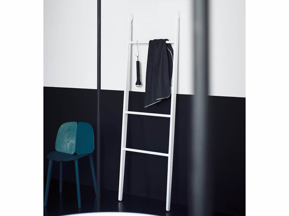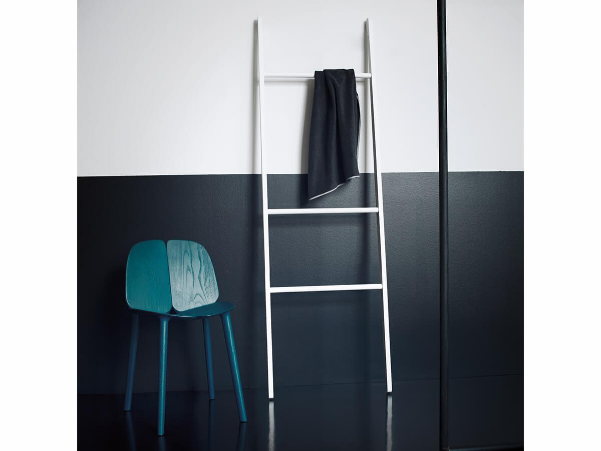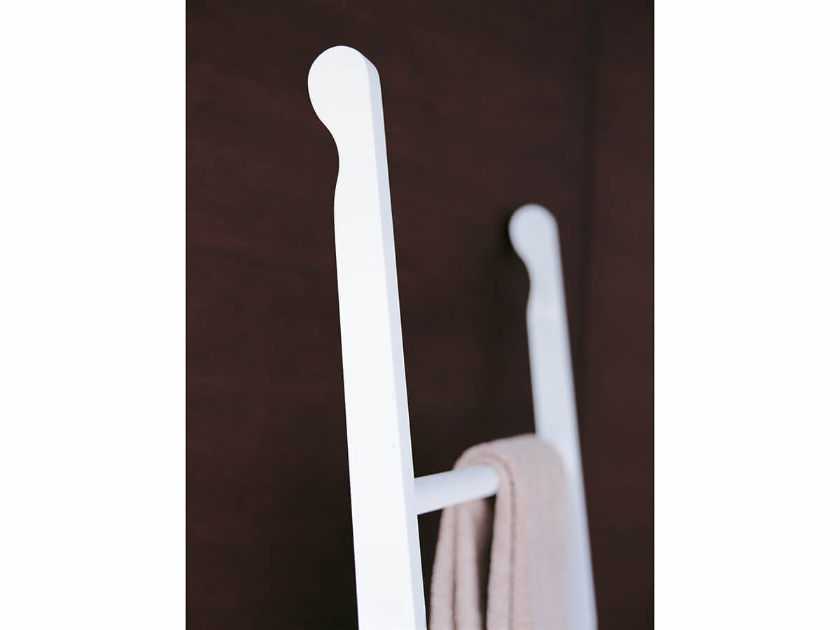 Versatile and scenographic, the Agape Stairs towel rail recalls in the shape that of a ladder leaning against the wall. It includes three different horizontal bars that allow the support of towels and towels and is available both in a version made of oak wood (natural or dark stained) and in a very elegant white painted version. A small shelving unit is also part of the Stairs line, in which the towel bars are replaced by five capacious shelves with a sloping depth. The two products can be combined in the same bathroom to create a practical and harmoniously coordinated environment.