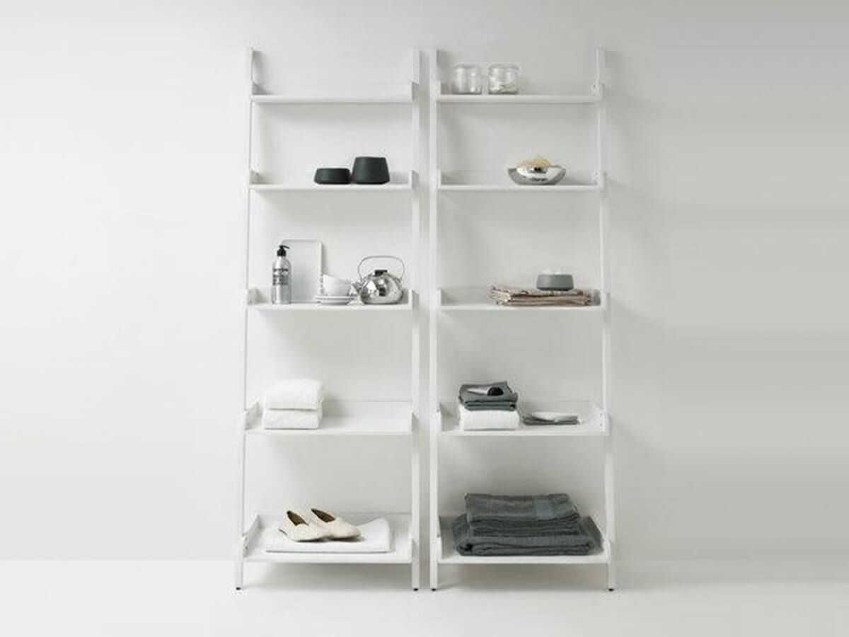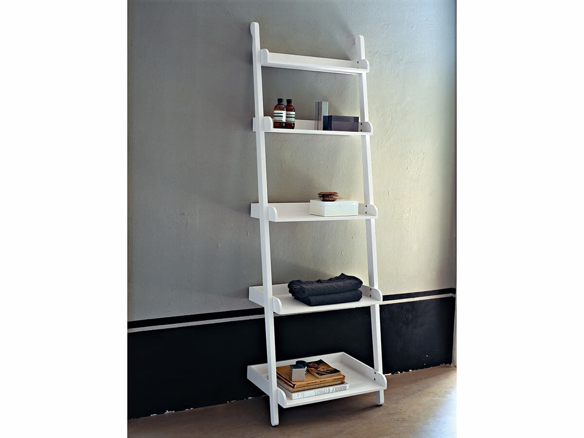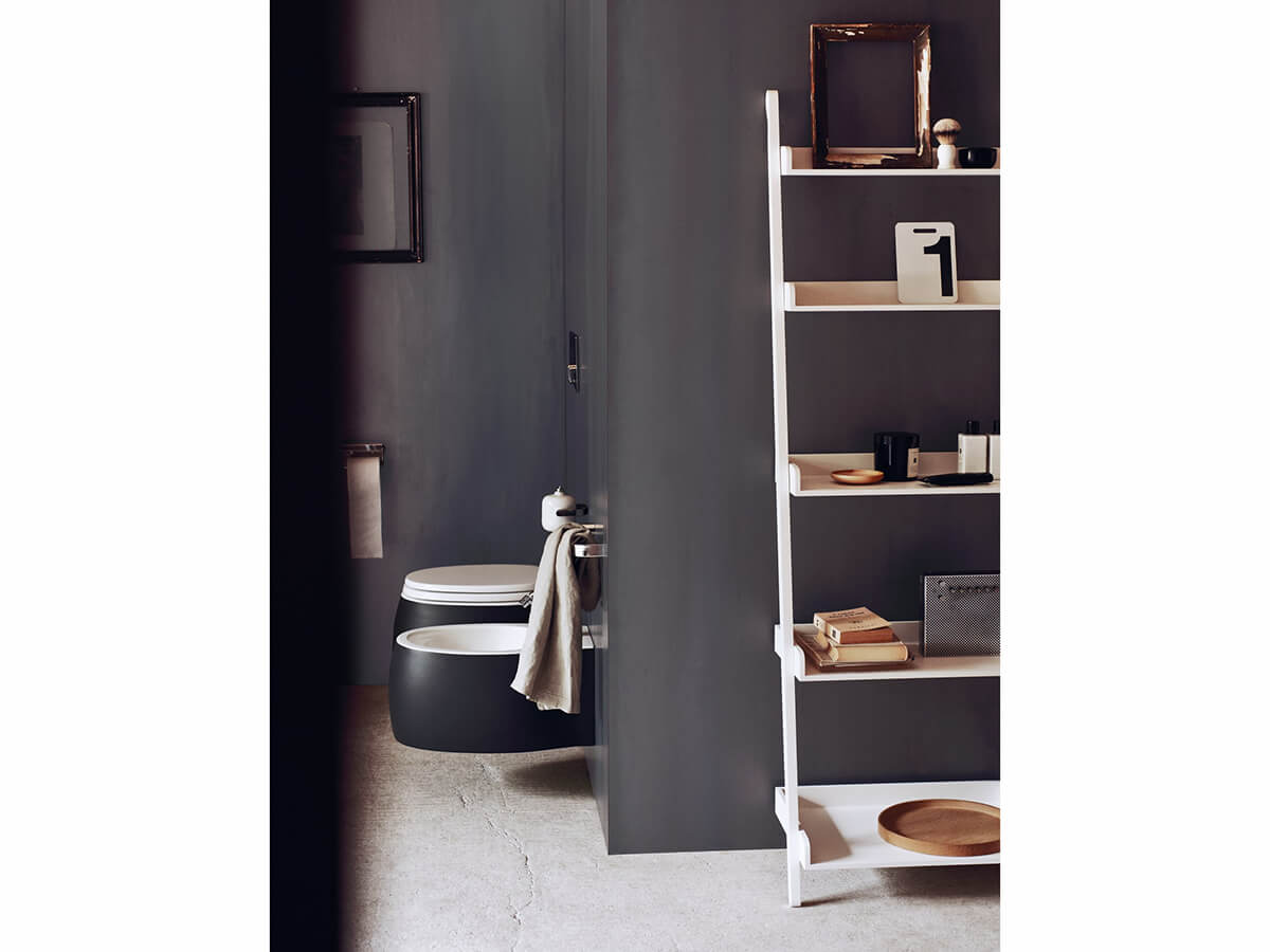 Versatile and scenographic, the Agape Stairs towel rail recalls in the shape that of a ladder leaning against the wall. It includes three different horizontal bars that allow the support of towels and towels and is available both in a version made of oak wood (natural or dark stained) and in a very elegant white painted version. A small shelving unit is also part of the Stairs line, in which the towel bars are replaced by five capacious shelves with a sloping depth. The two products can be combined in the same bathroom to create a practical and harmoniously coordinated environment.