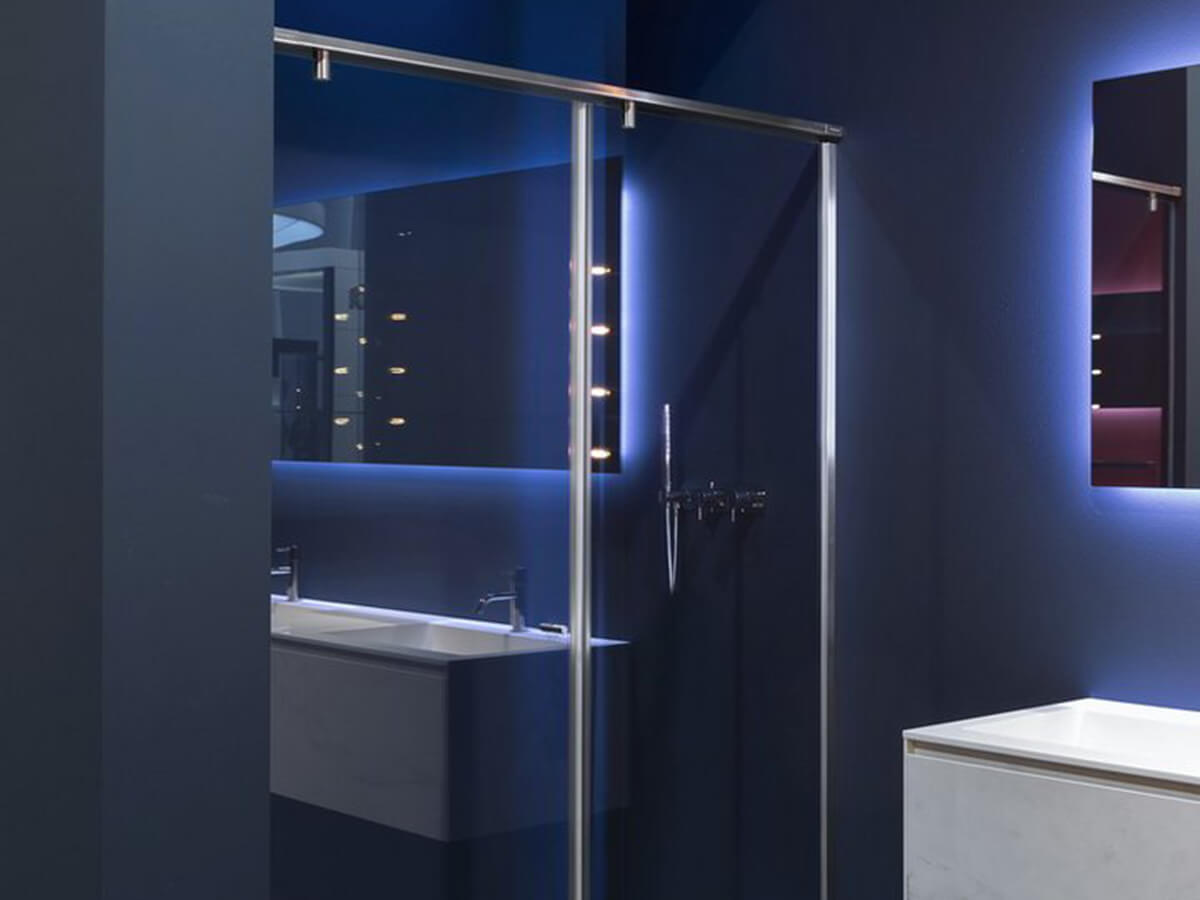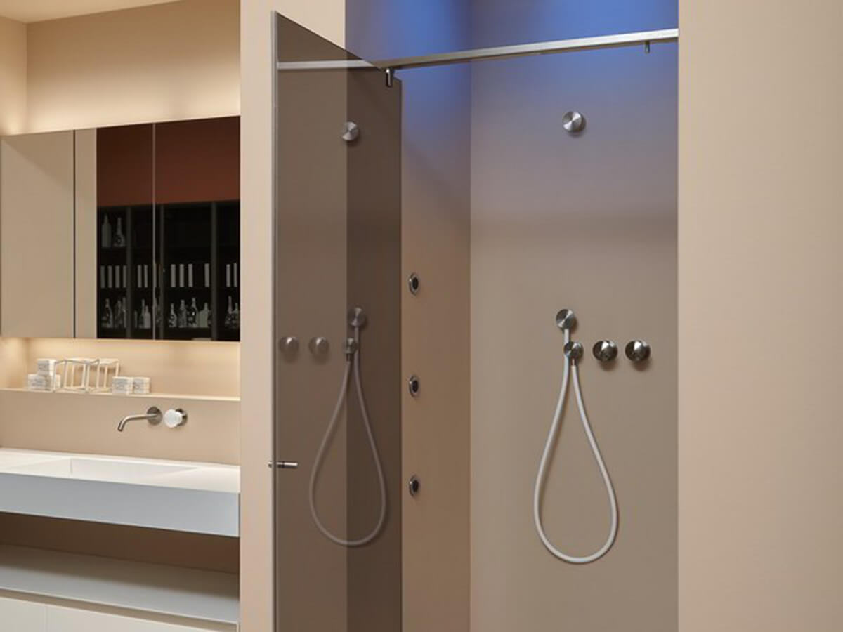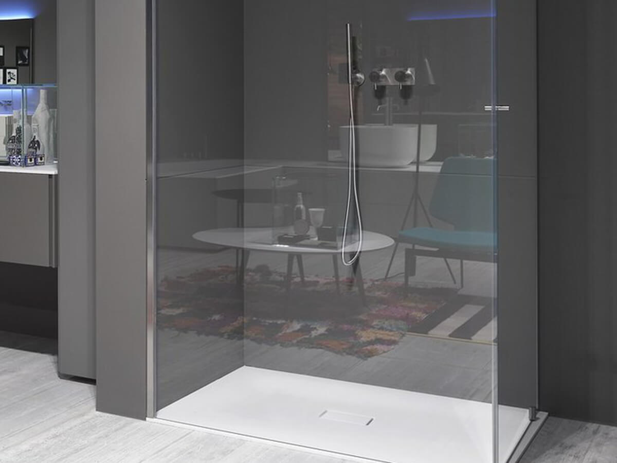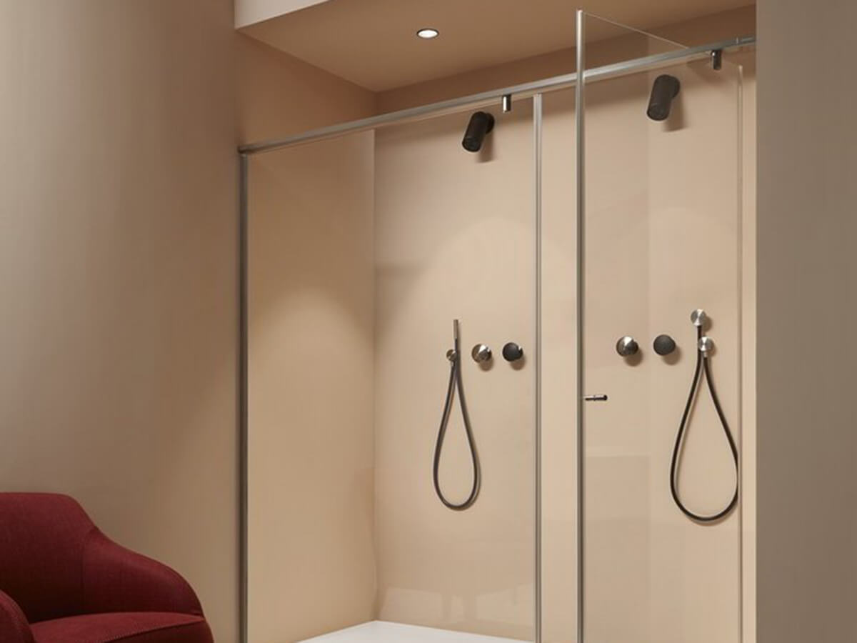 Essential and of great design versatility, the Bilico shower enclosure by Antoniolupi owes its name to the unusual mechanism chosen for opening the door, a pin that allows it to rotate widely and easily access the shower enclosure. Bilico is a shower that can be adapted to niches of any size, but can also be proposed in corner compositions. The door, also modular with other fixed glass walls, is supported by an overlying support crosspiece in AISI 304 stainless steel, to which the opening pin is fixed in a decentralized position. In compositions with large doors, the rotation of the door, on the other hand, takes place along a central axis.* Technical features: The glass of the Combi shower is available in different finishes: extra clear, etched, smoked, bronze and reflective smoked
