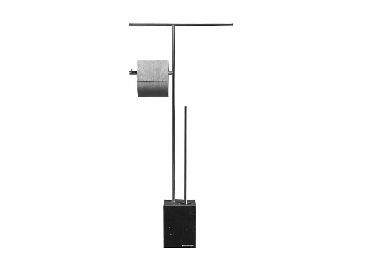 The Bivio series of floor lamps by Antoniolupi are developed in the name of a rigorous geometric linearity. Totally devoid of curves, the elements of the Bivio series branch out only through clear 90 ° angles, according to a clear sign that contributes to an overall impression of great formal cleanliness. The base has a cubic shape and is made of a precious material such as marble, while the structure can be made in satin steel, polished chrome, matt white or embossed colors that soften the rigor of the shapes, giving it a more light-hearted tone. Bivio is available in three different compositions and in the BivioCombi variant, which houses a spatula brush in the base for cleaning the toilet.