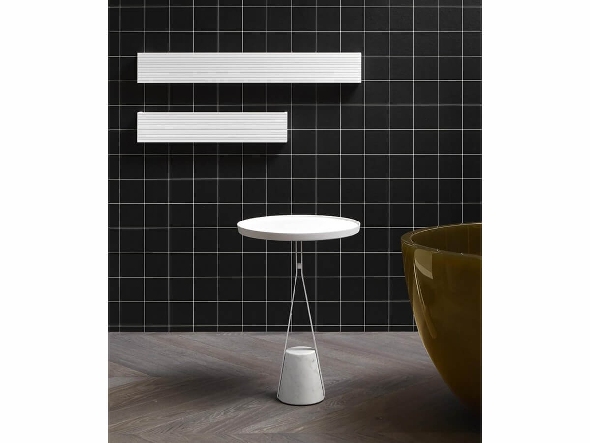 With the complexity of its shapes and the quality of its materials, the Halo towel rail by Antoniolupi is proposed as a real small sculpture for the bathroom. Halo, designed by the Calvi Brambilla studio, is an elegant object that arises from the contrast between the tension and movement of the threadlike metal structure in brass, whose shape resembles that of an elastic that is dragged downwards, and the solid anchorage of the marble base. in the shape of a truncated cone which ensures firm stability on the ground. The base is made of Carrara marble, while the structure can be painted in the different colors of the Antoniolupi range. Halo is also available in a version with a table function, in which the structure, instead of branching into the two lateral towel bars, acts as a support for a circular top in Flumood or Colormood.