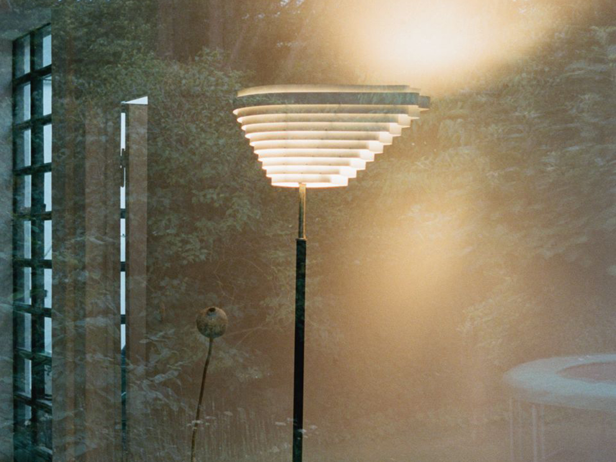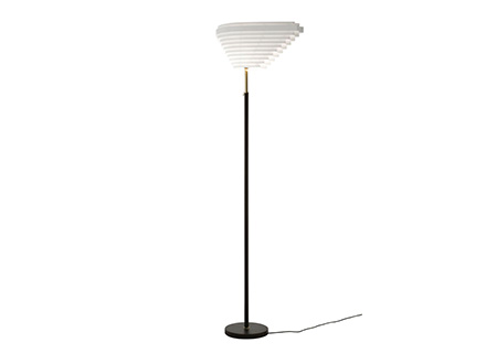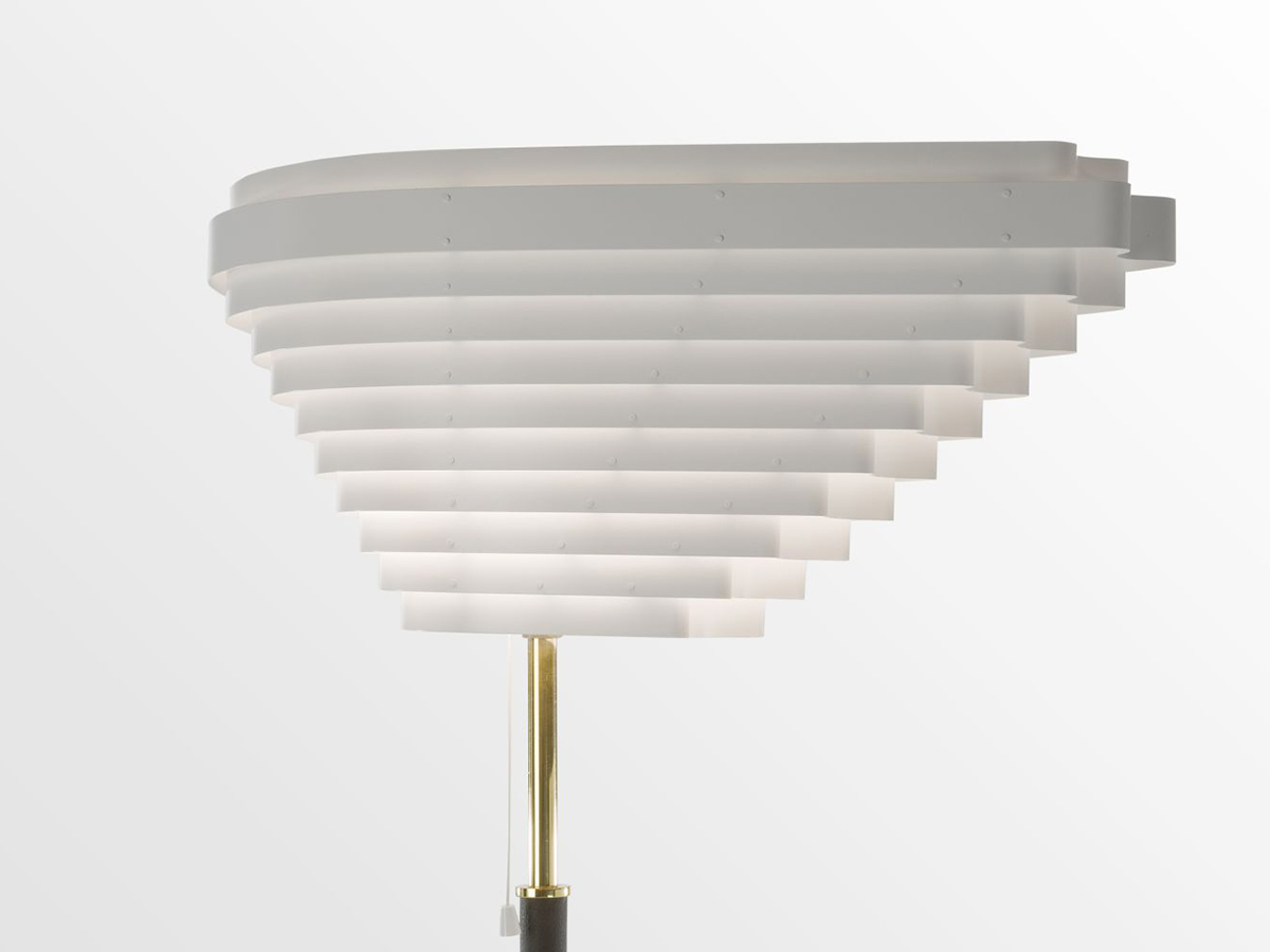 A lamp capable of awakening the imagination thanks to the plastic modernity of its avant-garde design. A805 comes with a surprising combination of lines and curves, allowing for great interaction between direct and indirect light, between reflection and sharpness. A polished brass collar offers a charming contrast to the white shade of the lampshade and the black leather finish of the stand. The shape is deliberately asymmetrical and recalls an angel's wing, a detail which gives it its name. The design is by Alvar Aalto, creator of numerous works for Artek, as well as an undisputed modernity among his other works.