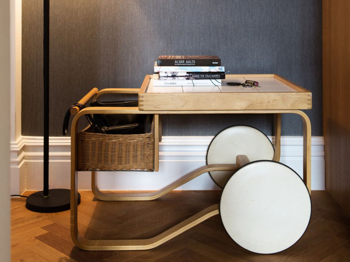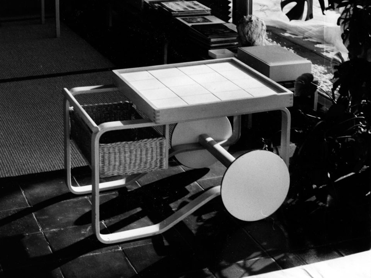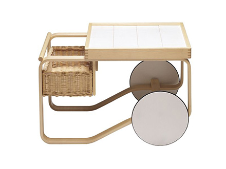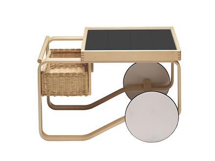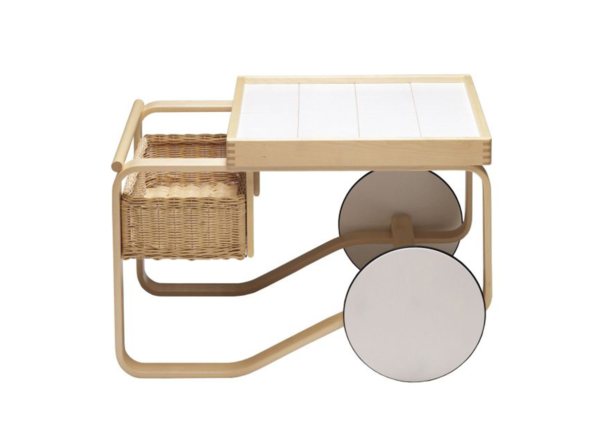 The 901 Tea Trolley by Alvar Aalto, produced by Artek since 1936, is the original declination of a typical English model filtered through the Scandinavian grace that hinges on the use of simplified shapes and natural materials. The great harmony of shapes makes it one of the most fascinating and current creations in all of Aalto's work, as well as probably the most famous tea trolley in the entire history of design. The curved wooden profiles support two large shelves and connect to the two large circular wheels, also in wood, which, despite their formal cleanliness, also take on great decorative value. In 1937 Aalto designed a variant of this model, the 900 trolley, initially conceived for the 1937 Paris International Exhibition. This version differs in the presence of a single upper support surface, with more restricted proportions, to which accompanies a charming rattan basket.