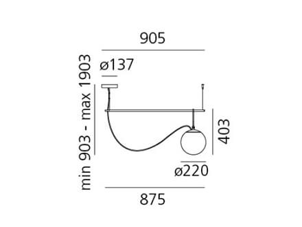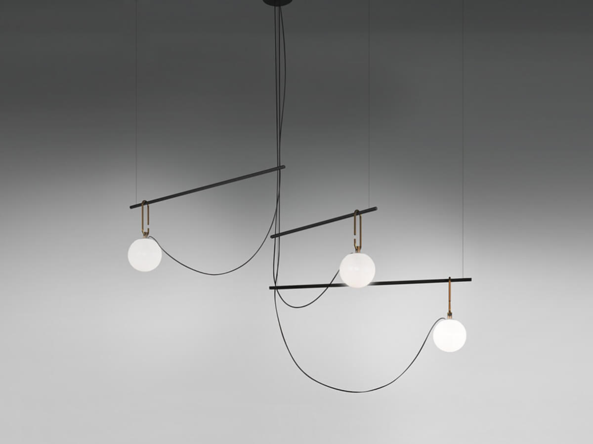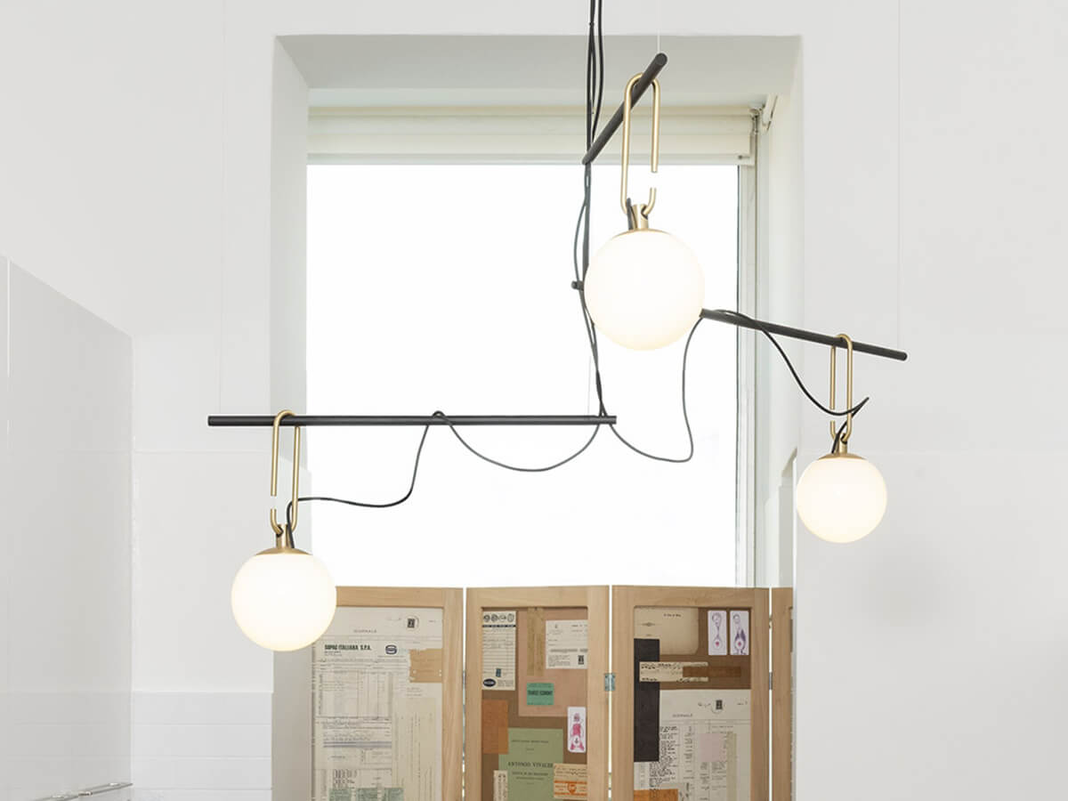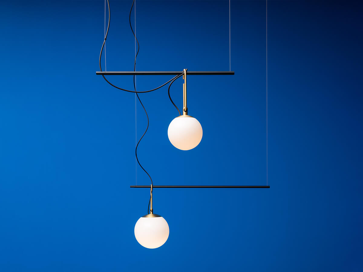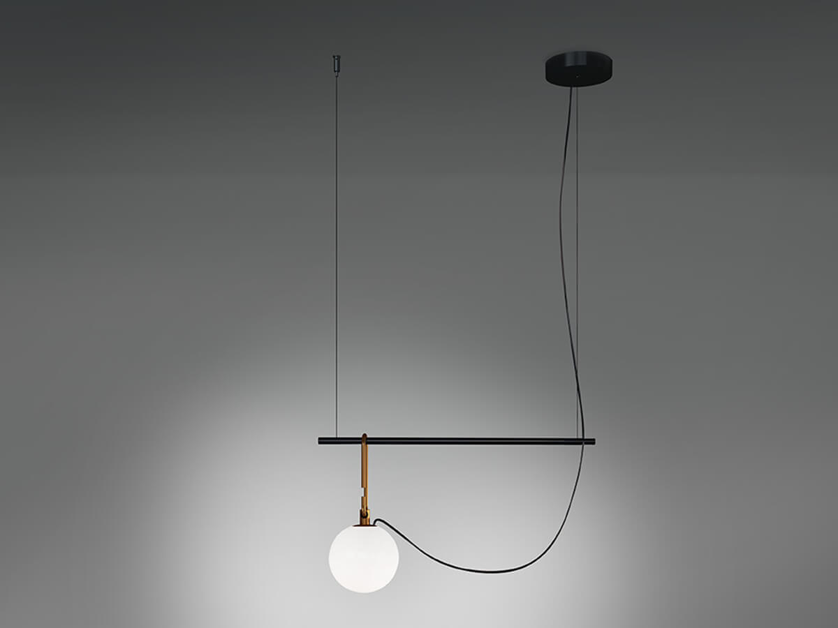 A lamp with a simple and extremely elegant design, capable of capturing attention for the strong versatility that seems to have inspired it. The suspension structure consists of a white blown glass sphere attached to a brushed brass ring that allows it to assume different positions thanks to the movement on the horizontal bar anchored to the ceiling. In its suspension version, NH stands out for its taste and attention to every detail that places it well in heterogeneous situations of living, sleeping and office spaces, without however neglecting more public situations. Originally born from the table version, NH has subsequently increased its conformations to better adapt to the needs of the modern home.