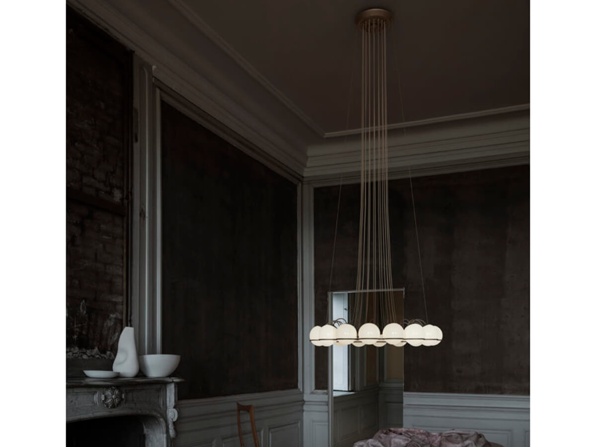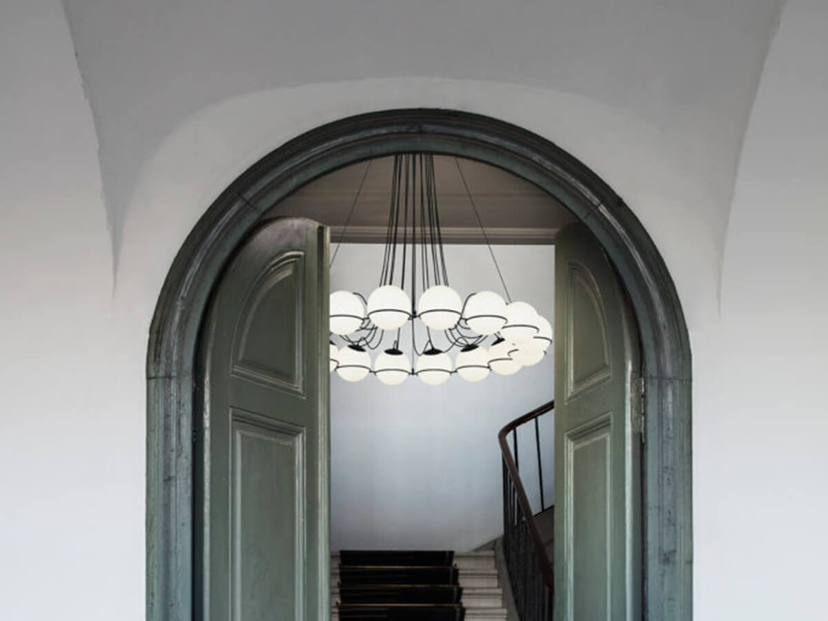The 2109 model was born from Gino Sarfatti's design, an example of suspension lighting by the Astep brand which is part of the homonymous collection whose steel structure is particularly distinctive together with the blown opal glass diffuser. The beauty of Le Sfere 2109 model consists precisely in the perfect proportion of each of its components, capable of being placed in harmony with the others in order to create a refined and elaborate object, ideal for different rooms in the house but also more formal spaces, where the need for a distinctive and strongly characterized element.
