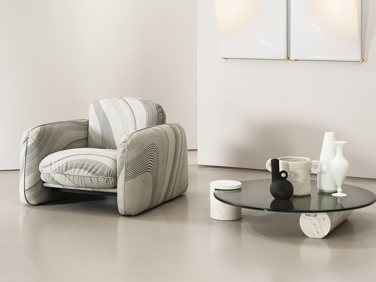 The Brigitte armchair expresses an extremely contemporary idea of designing, where individual elements apparently in their own right manage to merge into a whole of extreme value. Brigitte has a honeycomb structure of fir and beech. The back is in curved birch plywood. The padding in differentiated density polyurethane foam with acrylic fiber covering welcomes the body in a soft and extremely comfortable embrace. Even in its sofa version, Brigitte stands out for its sober and inspiring character. As always, Baxter leather plays a decisive role in enhancing the beauty of each model, giving prestige to the company's craftsmanship quality.