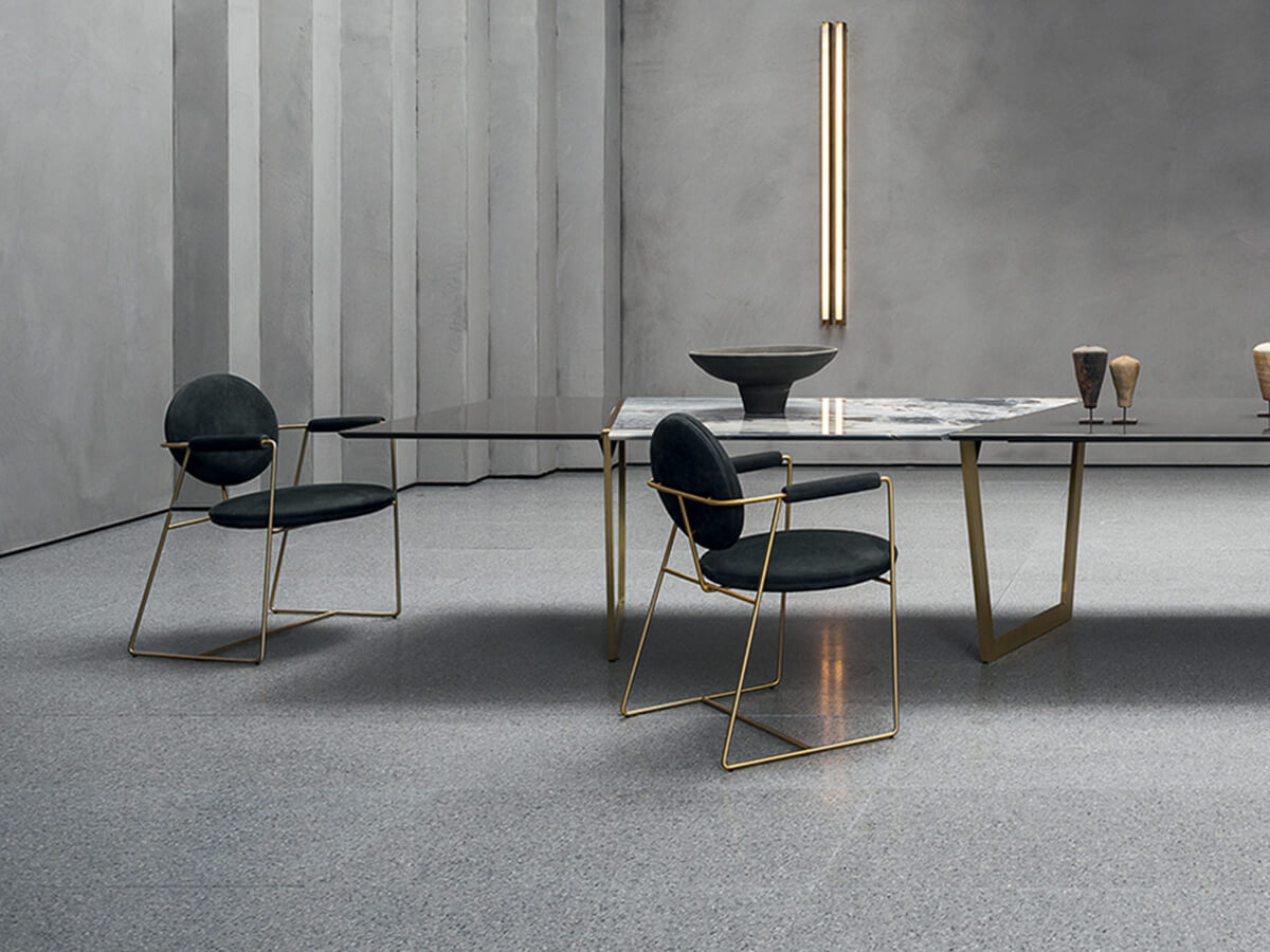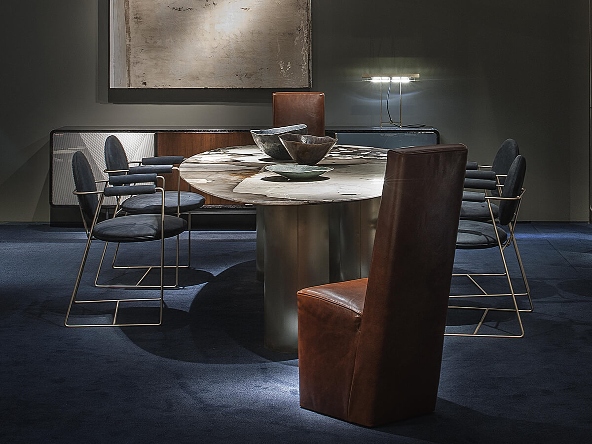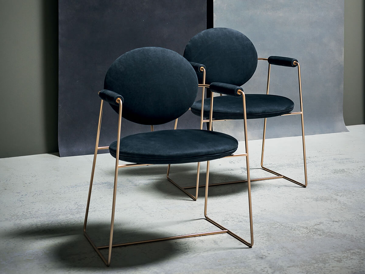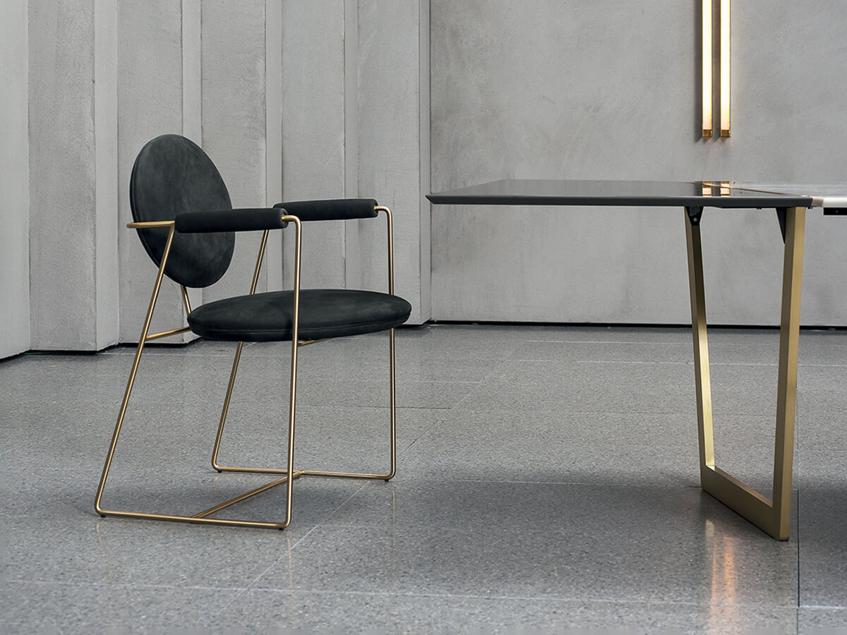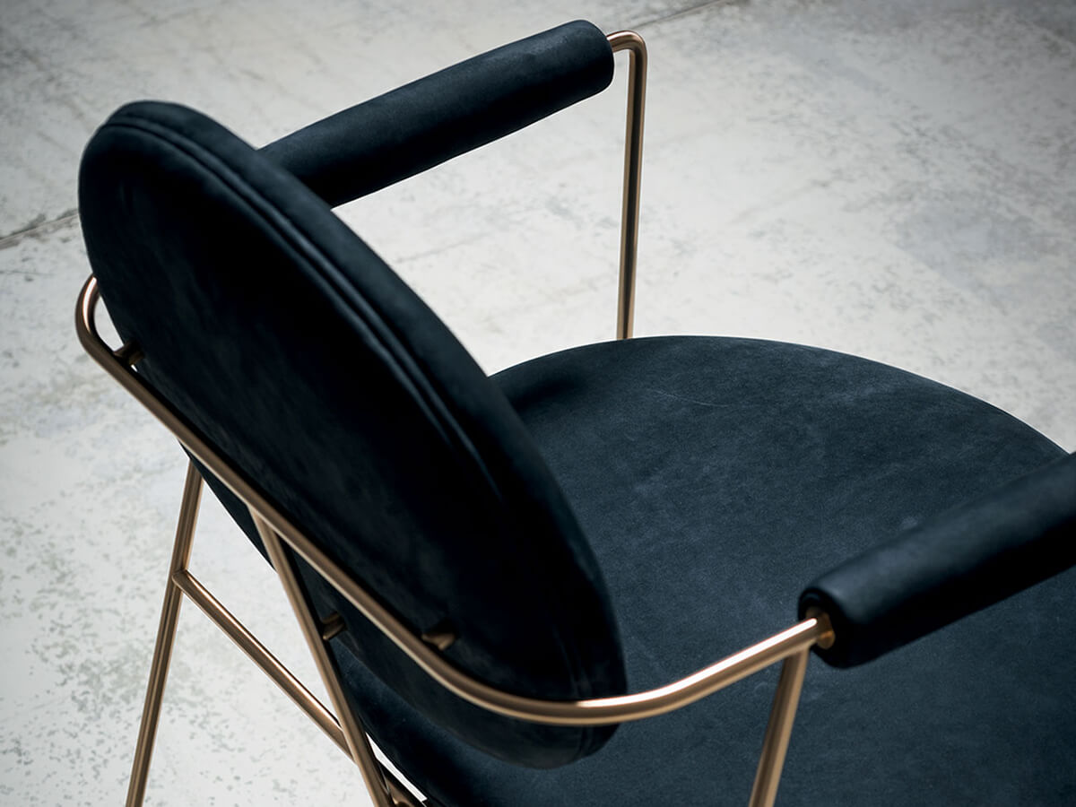 The Gemma chair is an example of essence and form united in a whole of extreme refinement. Ideal for spaces reserved for banquets, such as dining rooms and living spaces, it does not disdain a more heterogeneous use depending on the taste or needs of the individual. The structure is in metal rods in different finishes including satin brass, brushed burnished or satin nickel. The seat and backrest structure are in beech plywood, with armrests in solid beech. The padding is polyurethane foam with acrylic fiber coating. The model features a decorative profile in the same shade of leather.