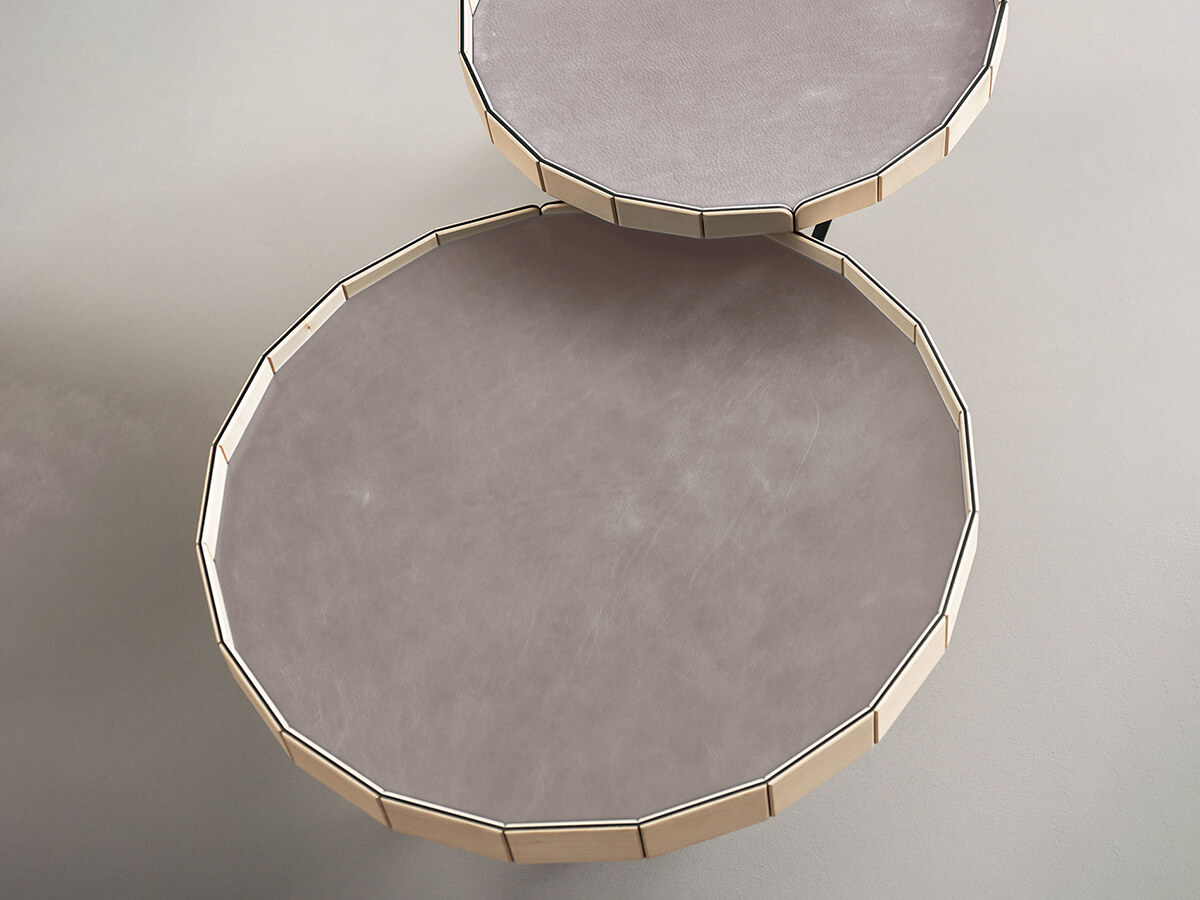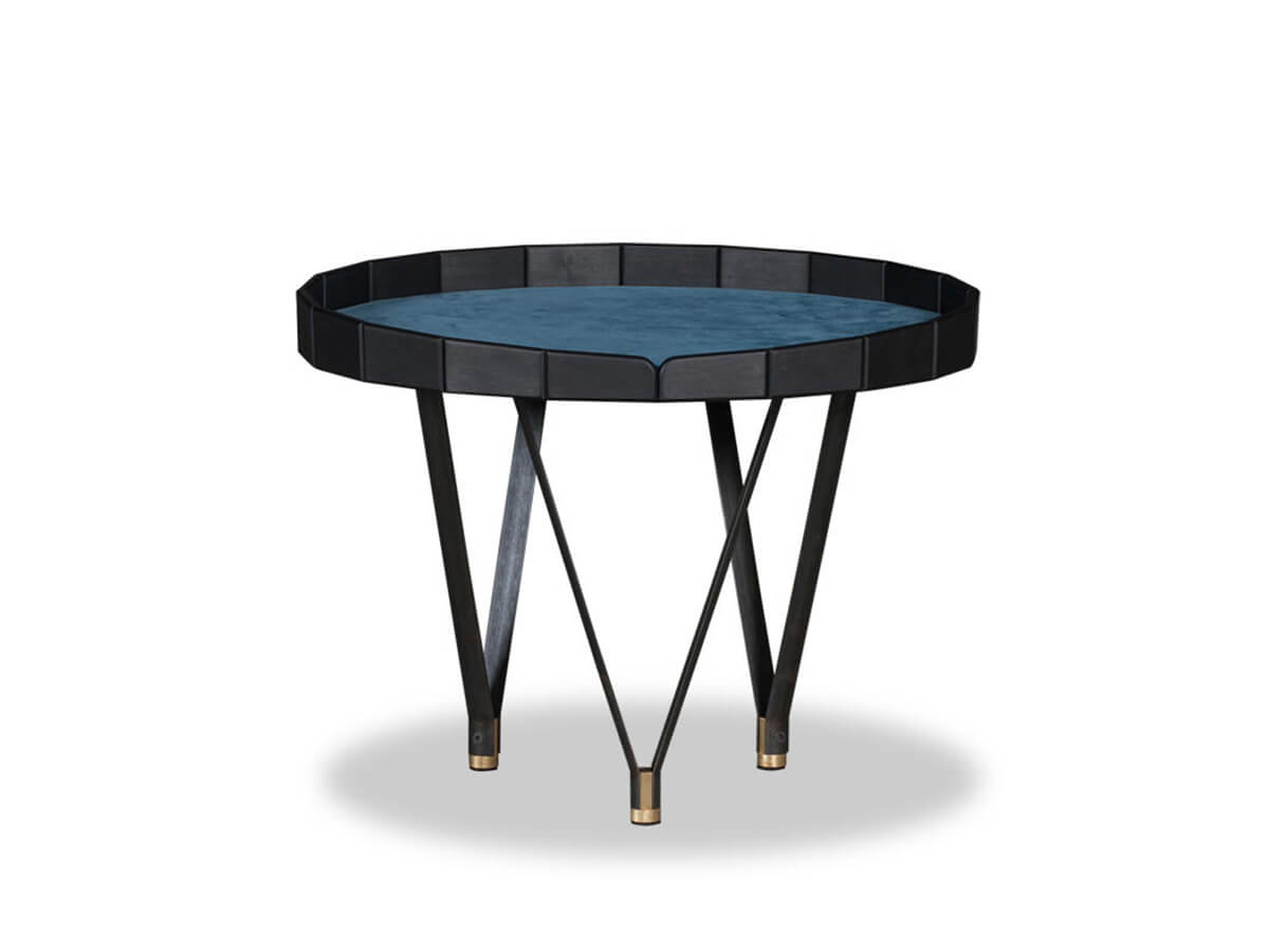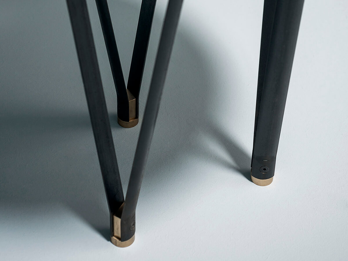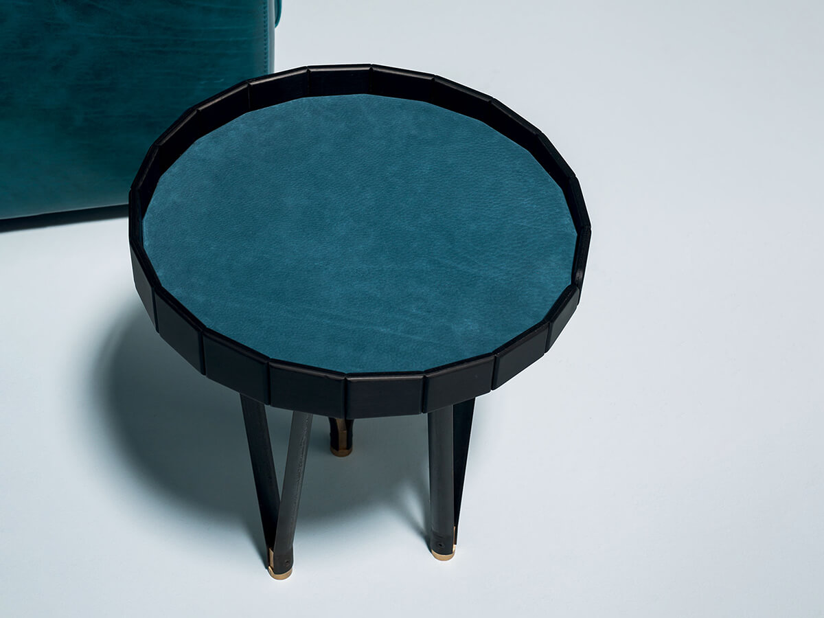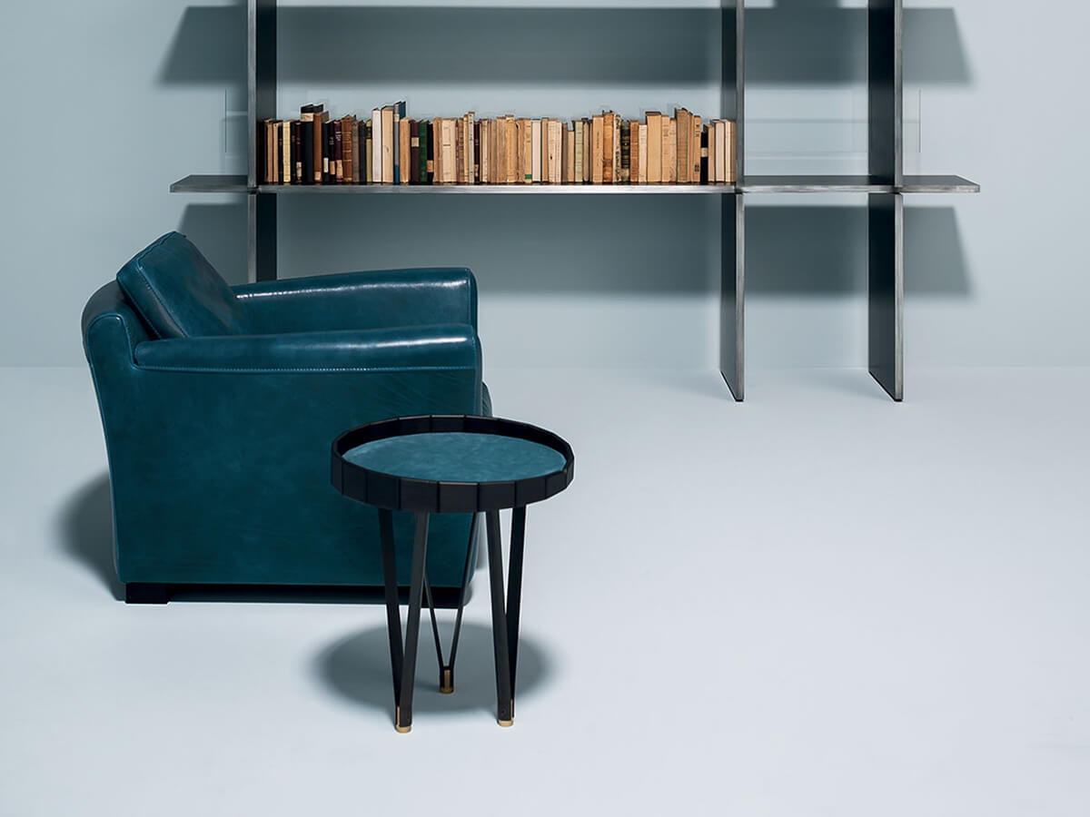The Ninfea collection includes numerous proposals for the home, ranging from a selection of coffee tables to bedside tables for the night space. In any sense, Ninfea remains an extremely versatile line, capable of configuring itself in any environment without ever clashing. As a coffee table, Ninfea has a characteristic play of legs, modeled so as to form three triangles surmounted by metal feet that lighten and raise the figure as a whole. The countertop is surrounded by a perimeter made by folding a panel obtained by pressing together strips of solid maple, black dyed leather and other strips of solid maple. The resulting effect is functional and original.* Technical features: black metal base with brass feet