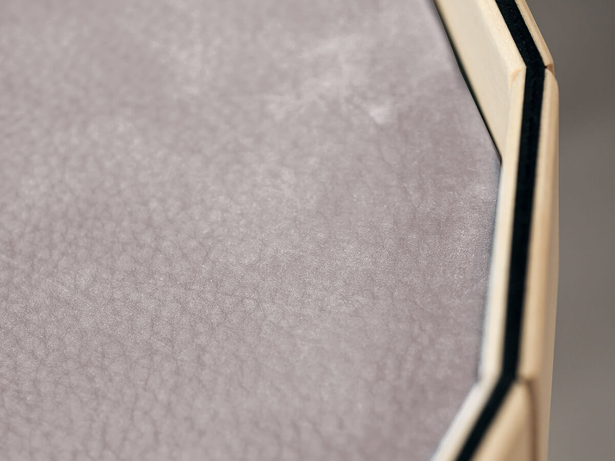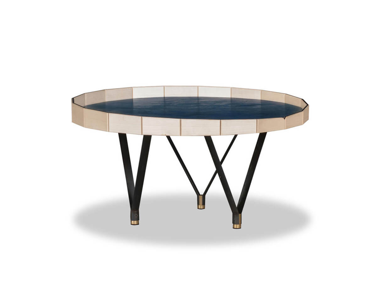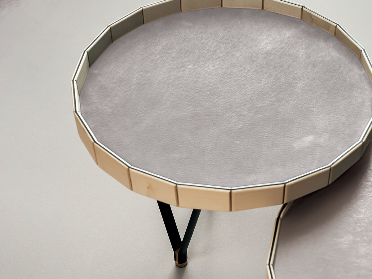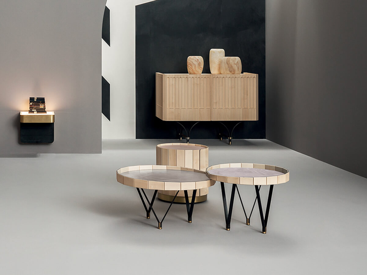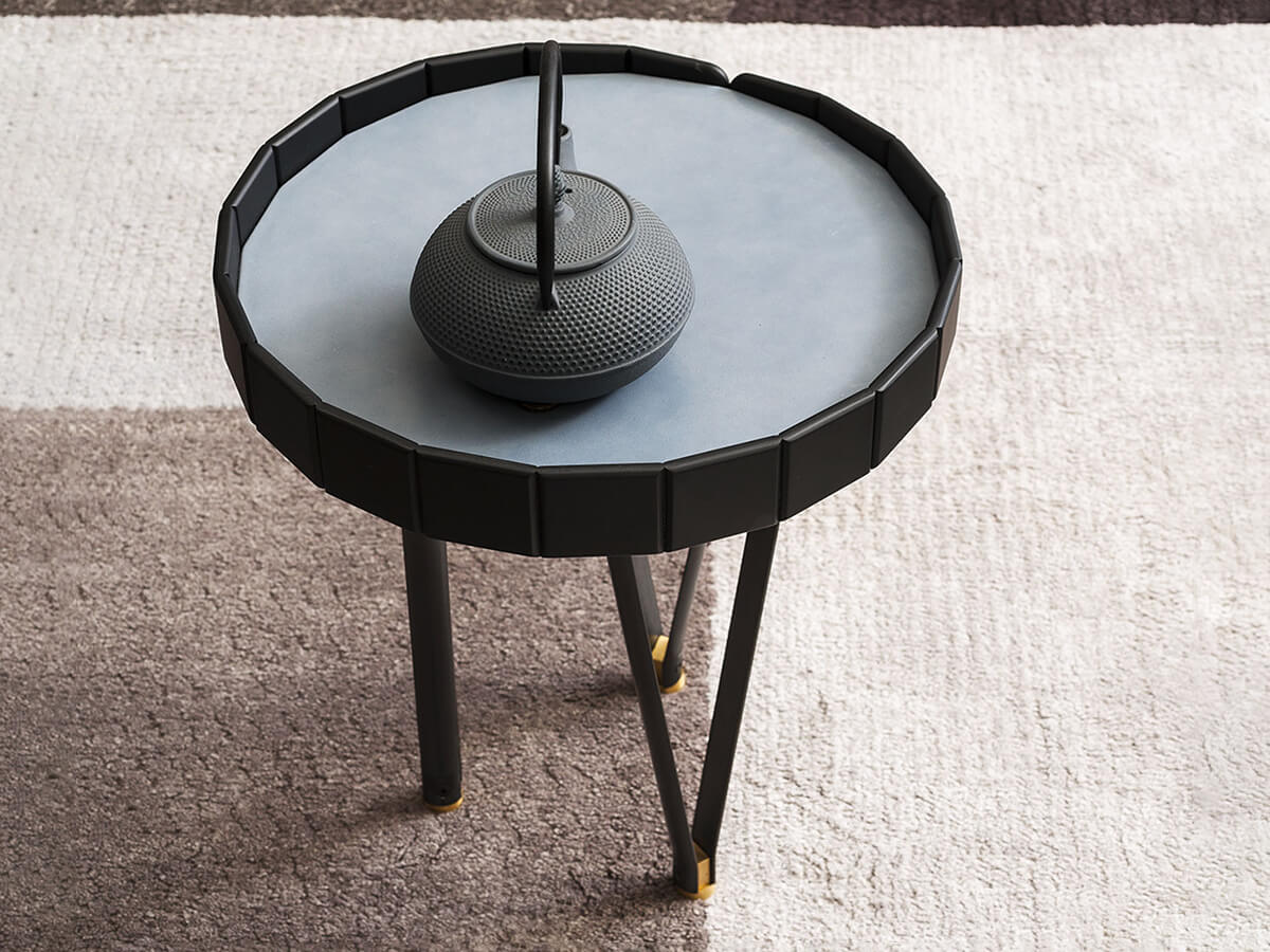 The Ninfea collection includes numerous proposals for the home, ranging from a selection of coffee tables to bedside tables for the night space. In any sense, Ninfea remains an extremely versatile line, capable of configuring itself in any environment without ever clashing. As a coffee table, Ninfea has a characteristic play of legs, modeled so as to form three triangles surmounted by metal feet that lighten and raise the figure as a whole. The countertop is surrounded by a perimeter made by folding a panel obtained by pressing together strips of solid maple, black dyed leather and other strips of solid maple. The resulting effect is functional and original.* Technical features: black metal base with brass feet