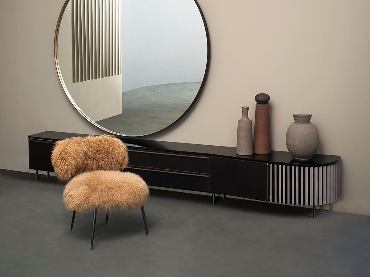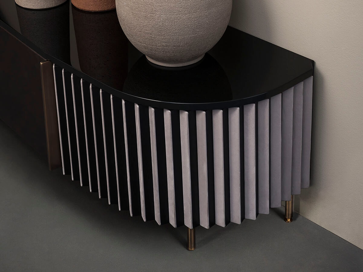 The Plissé product line expresses a way of perceiving fresh and original furniture that nevertheless does not disdain a note of nostalgia for the tastes and fashions of the last century. In its sideboard version Plissé stands out for its rounded shapes combined with precious metal inserts that with handles and feet embellish the figure giving it a refined character. A complete assortment of Baxter leathers contributes to making Plissé a multipurpose sideboard, suitable for different styles and tastes of the living space. The door is curved, made up of veneered poplar plywood. On the outside, a triangular pleated motif embellishes and gives a character of extreme personality to the entire structure.* Technical features: structure in matt black stained oak; base and handles in burnished brass; top in glossy black lacquer