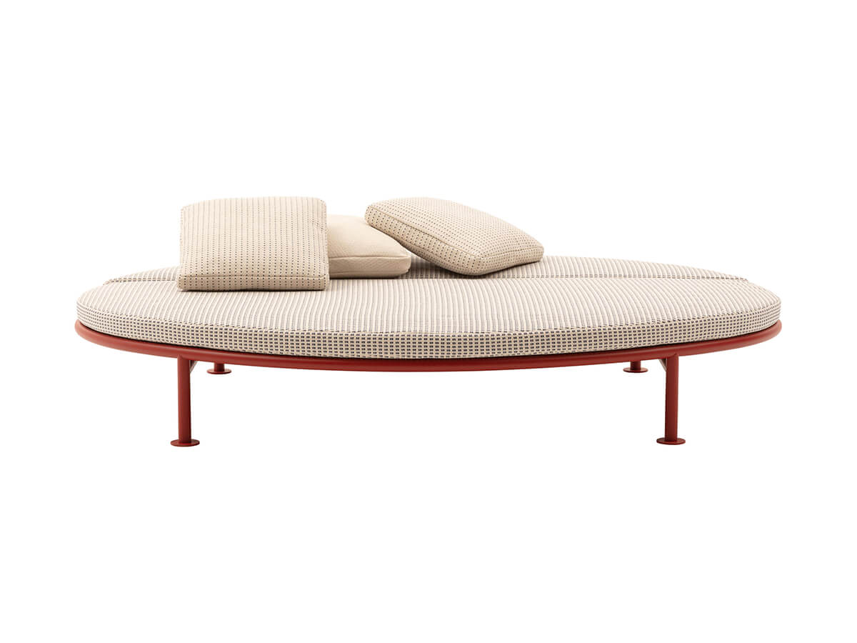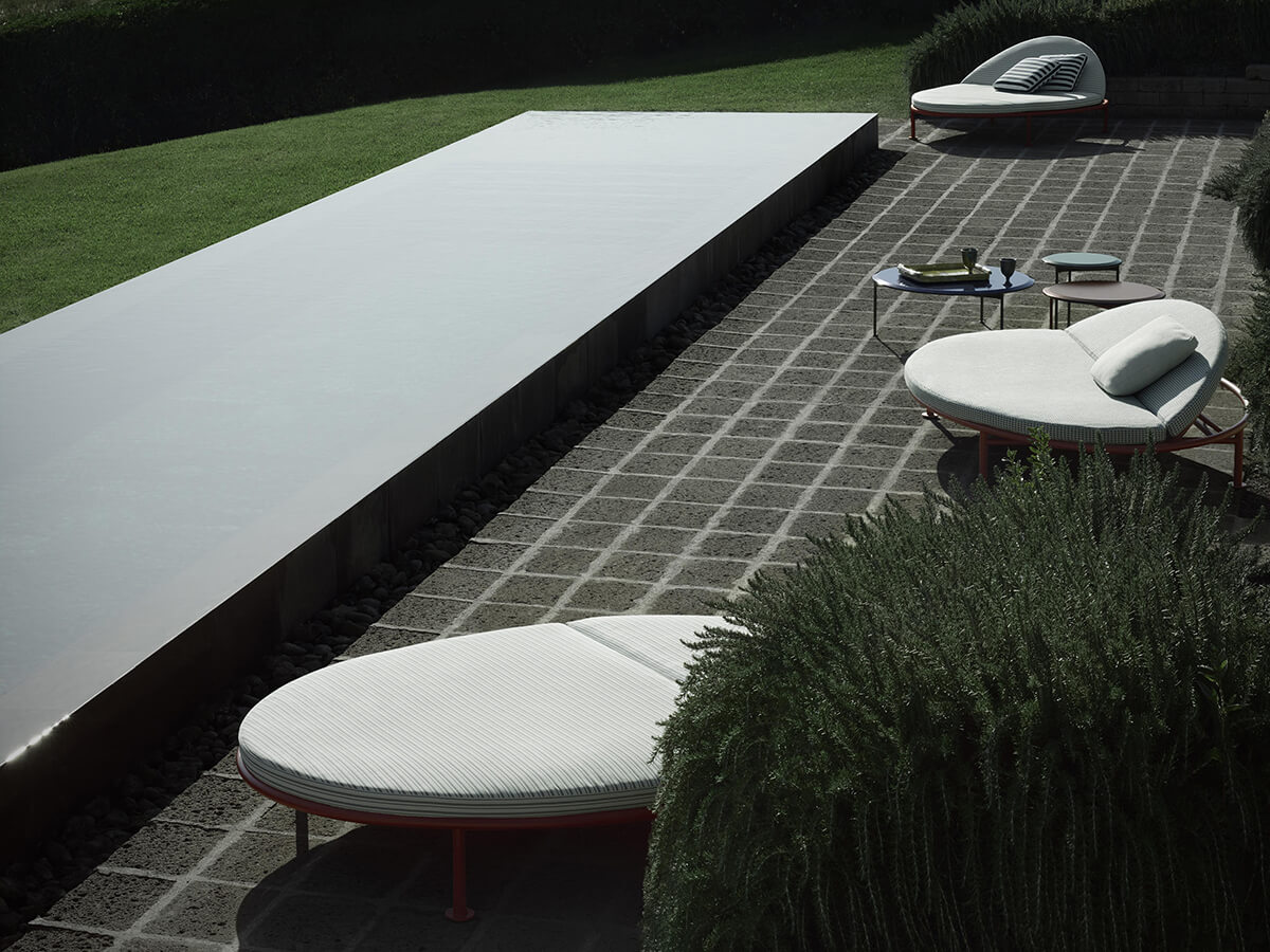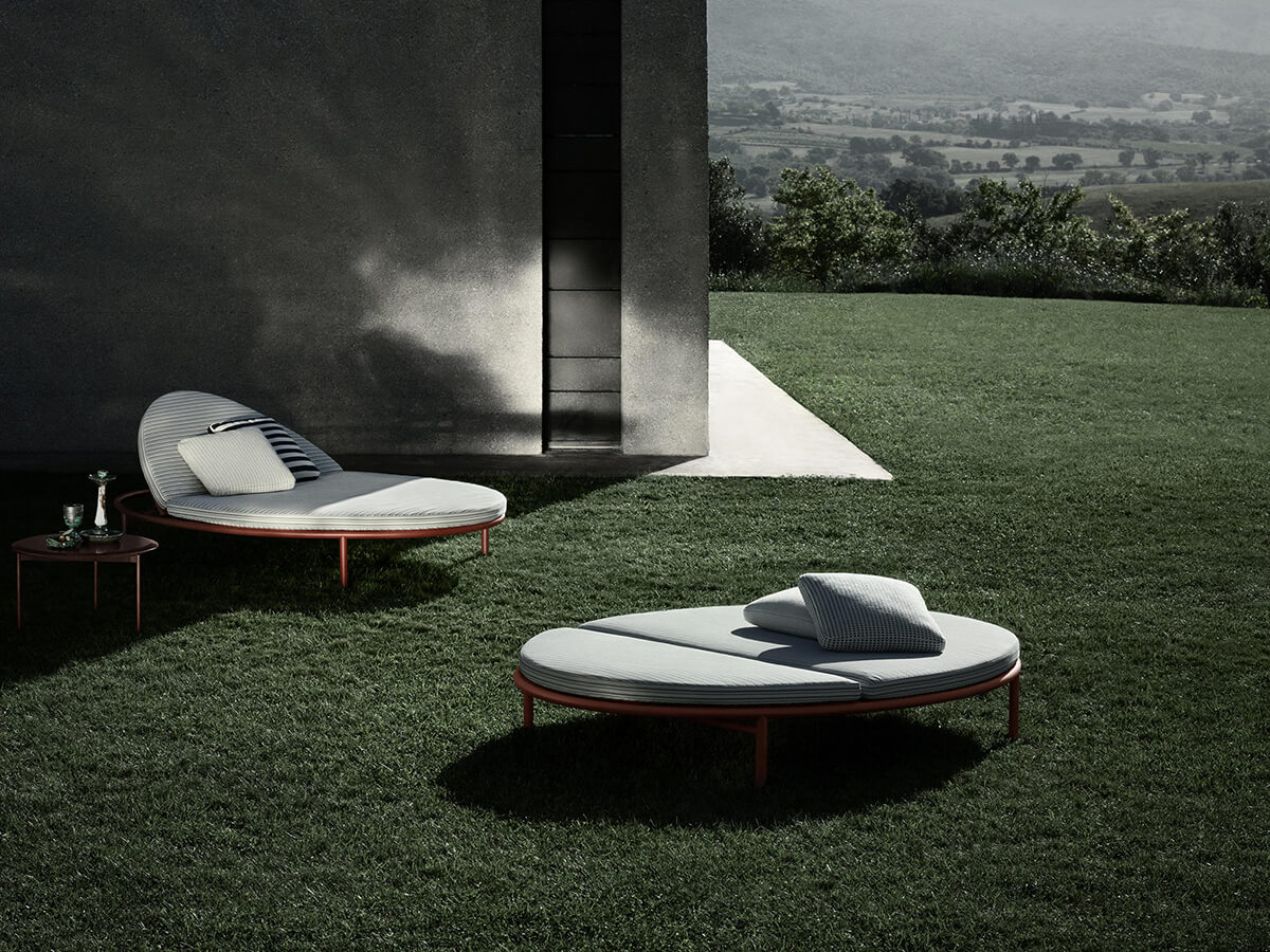 The Borea collection of outdoor furniture, designed by Piero Lissoni for B&B Italia, is enriched with new proposals for the poolside and the use of outdoor spaces. The sun lounger equipped with wheels and the oval sunbed, in the chaise longue or sofa version, are united by a light curved tubular aluminum structure, treated with weather resistant paint. The comfort is guaranteed by the large reclining backrests and by the mattresses in recycled material, covered with a wide selection of outdoor fabrics, exclusive to B&B Italia. The optional cushions allow to increase the relaxation of these seats with multiple uses, ideal in parks or by the swimming pool of private homes, hotels and exclusive resorts.