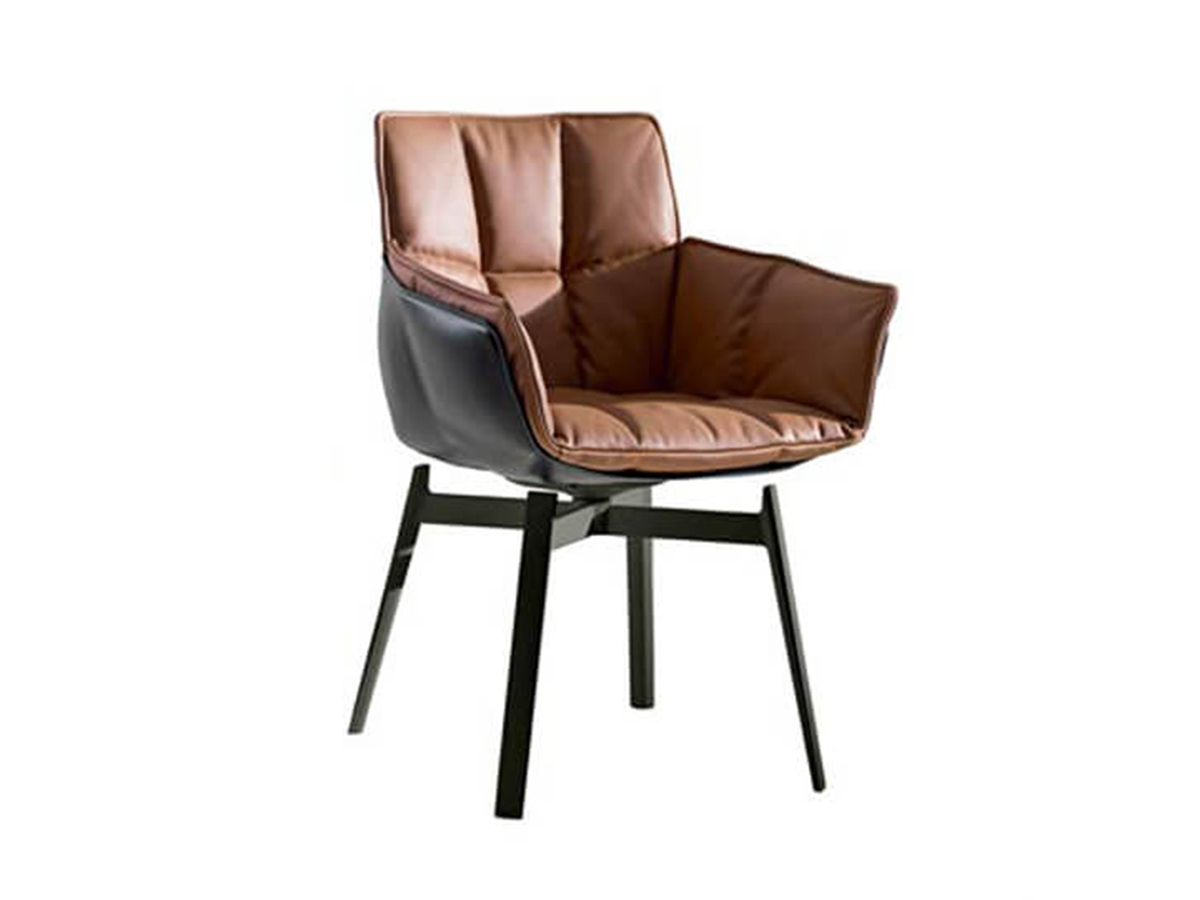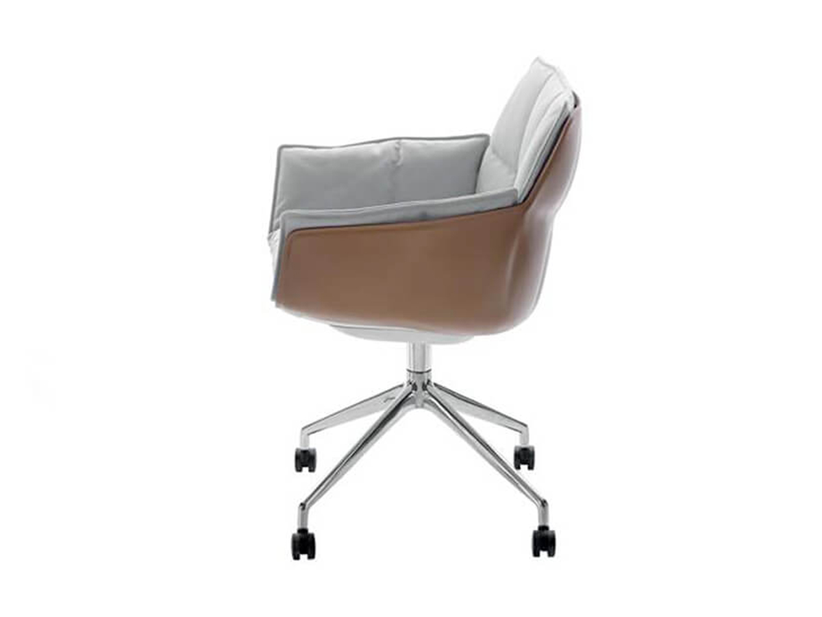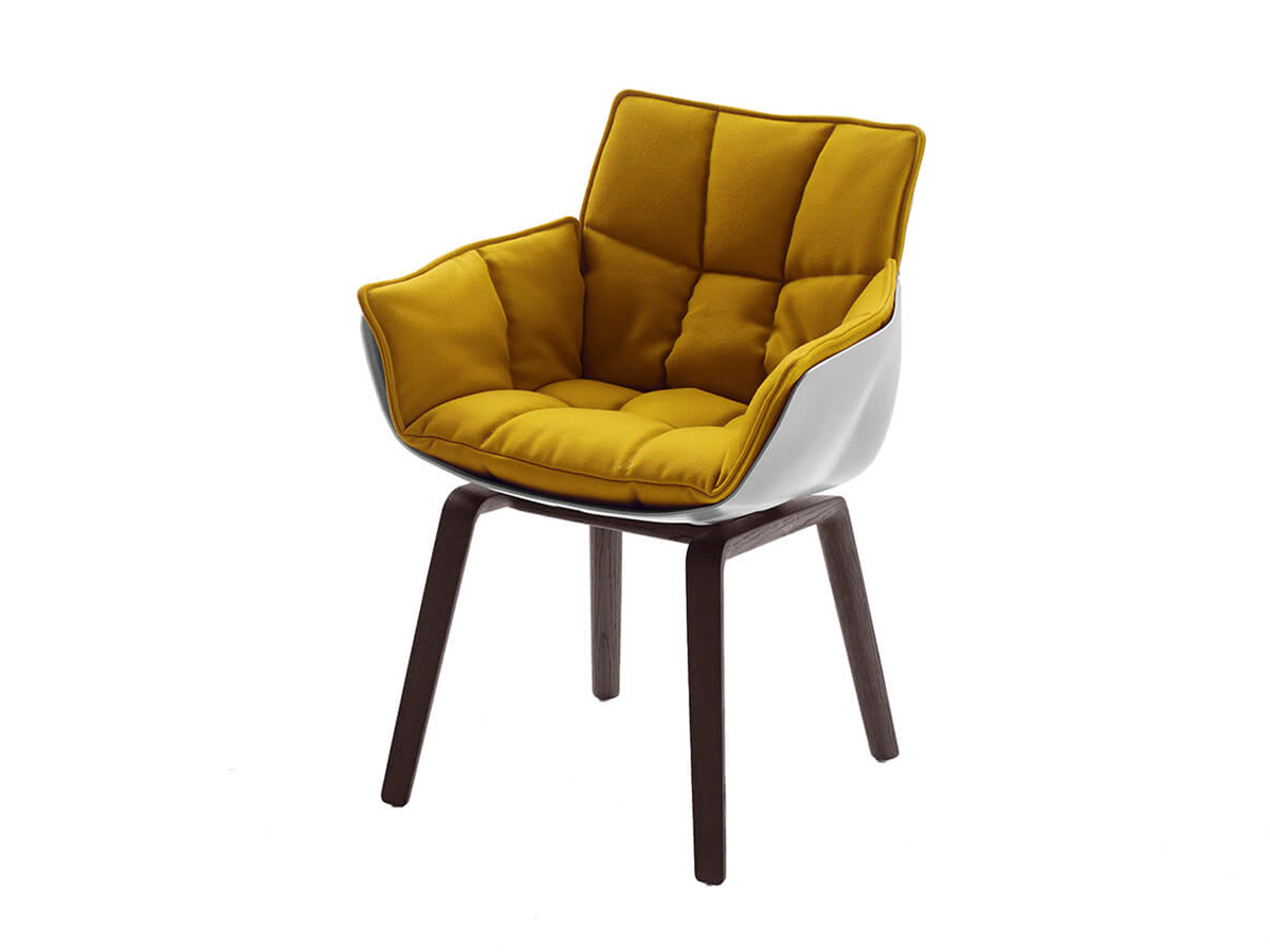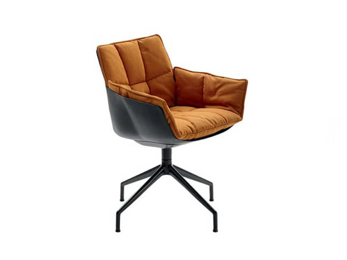 Husk is part of the homonymous seating series which includes armchairs, beds, coffee tables, beds and numerous outdoor elements. Each of these elements stands out for its unique design, capable of combining originality with a contemporary taste. Strong is the presence of unconventional colors and choices for the shell, legs and upholstery, each aimed at enhancing the structure and giving uniqueness to each complement. The solid high-density polyurethane resin shell of the Husk chair lays the foundations for a resistant and extremely versatile piece of furniture, capable of lending itself to numerous uses in both dining and living areas. The different configurations of the four-star base, swivel, with wheels and more increase the perception of a product on a human scale, perfect to adapt to everyone's lifestyle.
