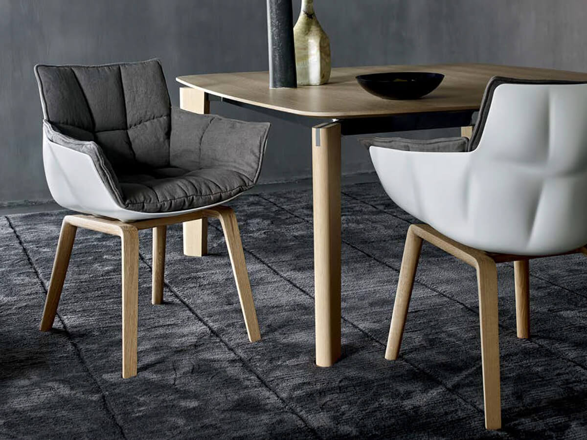 Husk is part of the homonymous seating series which includes armchairs, beds, coffee tables, beds and numerous outdoor elements. Each of these elements stands out for its unique design, capable of combining originality with a contemporary taste. Strong is the presence of unconventional colors and choices for the shell, legs and upholstery, each aimed at enhancing the structure and giving uniqueness to each complement. The solid high-density polyurethane resin shell of the Husk chair lays the foundations for a resistant and extremely versatile piece of furniture, capable of lending itself to numerous uses in both dining and living areas. The different configurations of the four-star base, swivel, with wheels and more increase the perception of a product on a human scale, perfect to adapt to everyone's lifestyle.