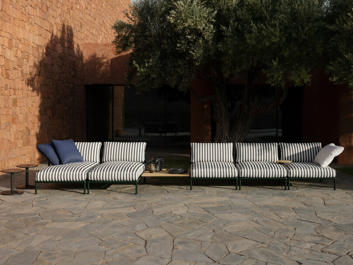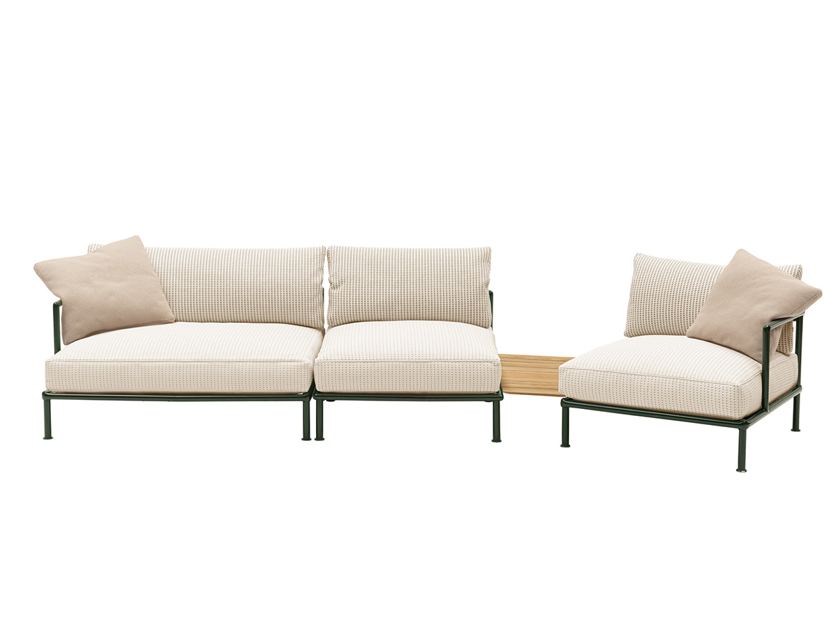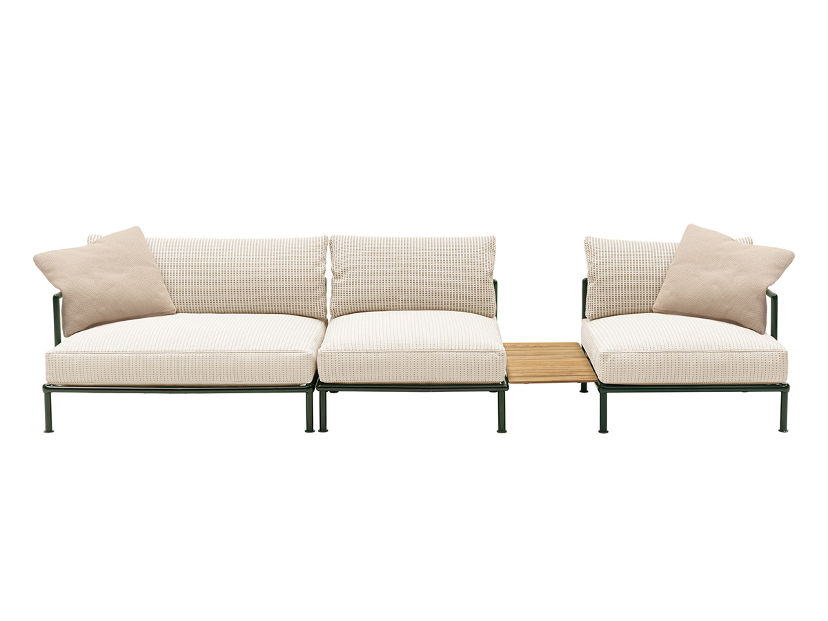 The Nooch sofa is part of a seating system created by Piero Lissoni and B&B Italia aimed at pursuing a dual intent: continuous modernization and sustainability in the outdoor sector. The result is a unique padded item, inspired by the tropical botanical garden of Nong Nooch in Thailand with a characteristic tubular structure in recycled aluminum which in turn is potentially infinitely recyclable. The design is simple and linear but does not lack artistic peculiarities such as the crossing points of the structural elements where an elegant elbow curve obtained by bending the tubulars stands out. Versatile and light also thanks to the thousand compositional potentials designed by B&B Italia, Nooch also features padding obtained from recycled materials, completely separable, which includes two layers of polyurethane with different densities and load-bearing capacity.