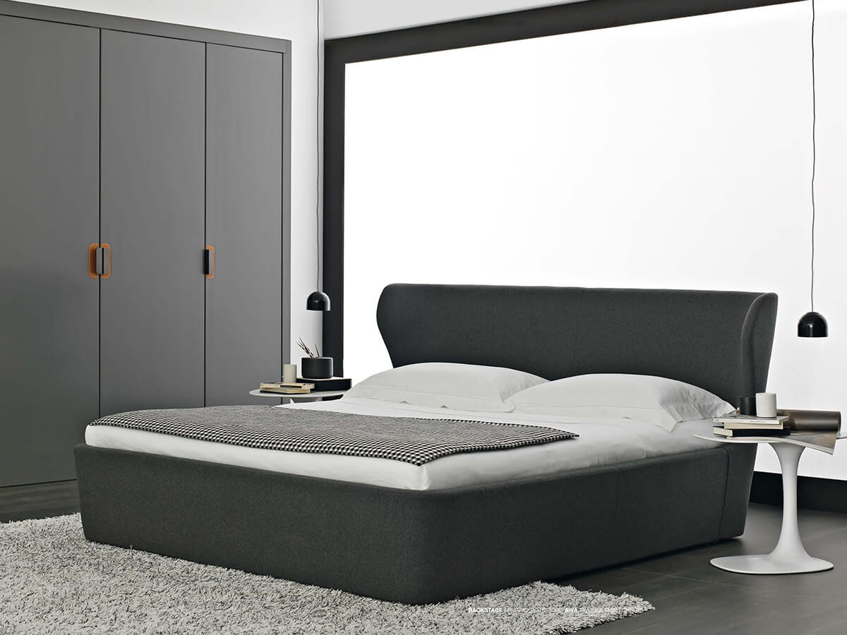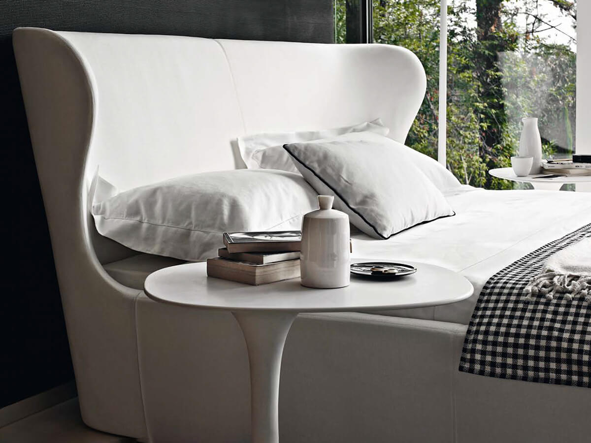 A tribute to contemporary design as well as an example of evocative imagery, the Papilio series of seats and upholstery is a guarantee of timeless elegance and design skills. In Latin Papilio means butterfly. Like all the other elements in the collection, the Papilio chest also shares the aspiration of high design and formal simplicity that have made them famous. The characteristic "wing" element is seen here in the bending of the headboard which on the sides proposes a soft curve capable of accommodating the body and harmonizing the entire structure. An equal reference to the proportions of the Papilio series is evident from the slightly conical and raised band with the mattress positioned flush with the perimeter.