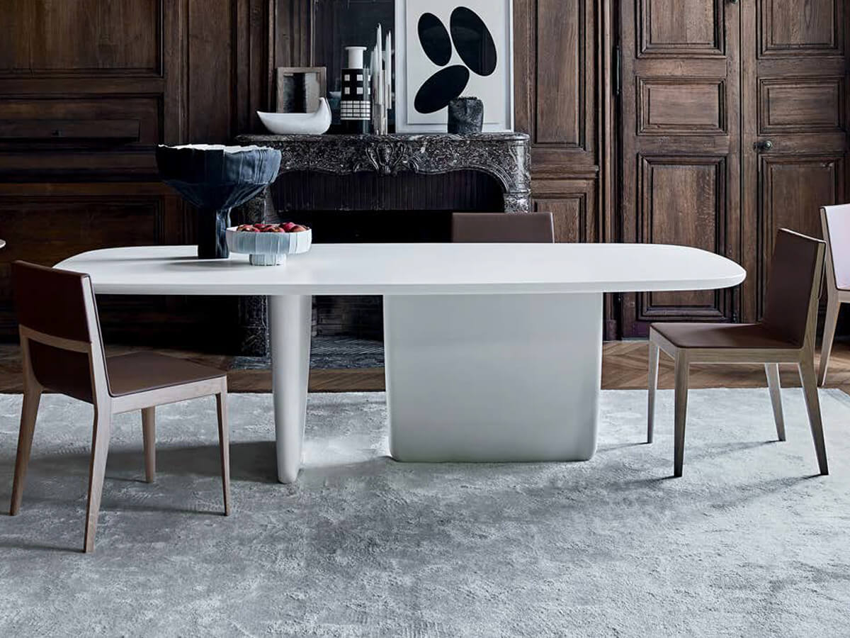 The Tobi-Ishi table conveys a design whose distinctly oriental references seem to draw directly from the Zen tradition of balance, elegance and essence. This round or rectangular dining table by Edward Barber & Jay Osgerby is particularly reminiscent of the polished stones (tobi-ishi) used for ornamental purposes in gardens. The choice of using two large vertical trapezoidal bases placed orthogonally to each other generates a suggestive composition, capable of changing and taking on completely different facets depending on the point of observation. The overlying top, thin and finely modeled, creates a perfect sculptural synthesis, further accentuated by the choice of precious materials such as marble and others.