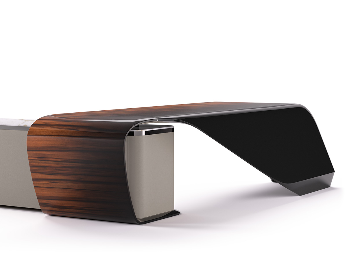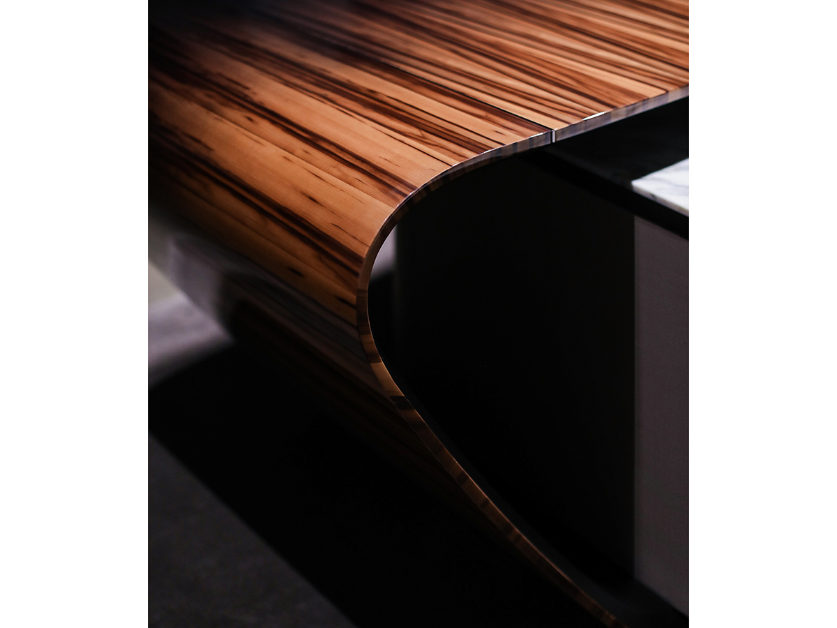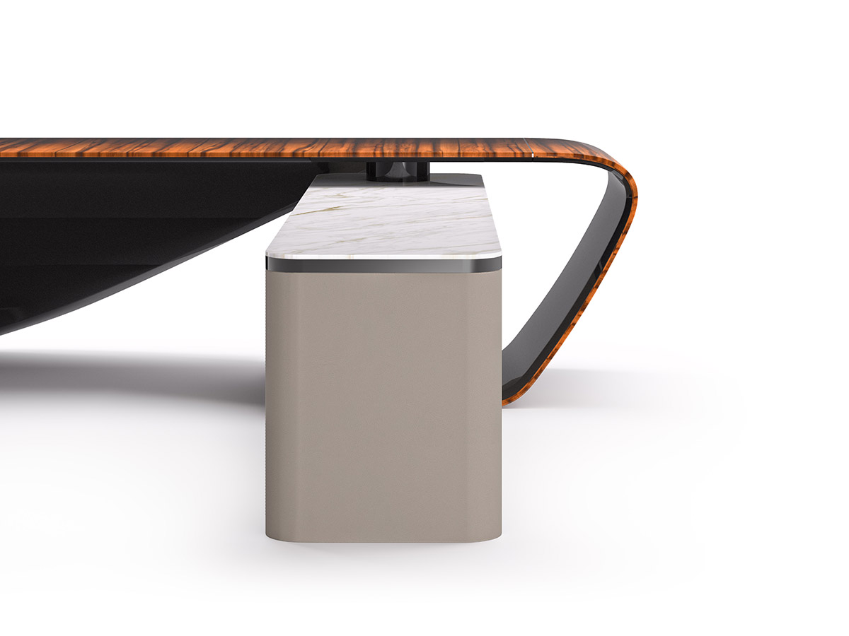 The designer Carlo Colombo designs the Styal desk in collaboration with the Bentley Home team, giving life to an iconic, luxurious and refined product in every detail. The wooden structure, with an original aerodynamic shape, is made up of four elements, divided by a metal profile, which can be upholstered in Vermont leather or veneered in walnut root or other essences, with a glossy brushed finish. An unprecedented degradé lacquered finish is also available on request, which makes the product unique and unrepeatable. The desk interfaces at 90° with a wooden sideboard covered in Vermont leather with metal decoration. The top is available both in wood covered in leather and in Calacatta or Valentine Gray marble.