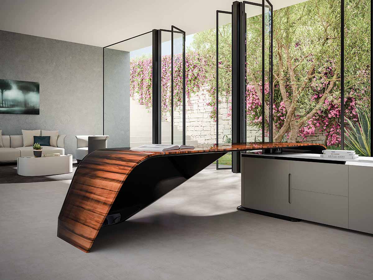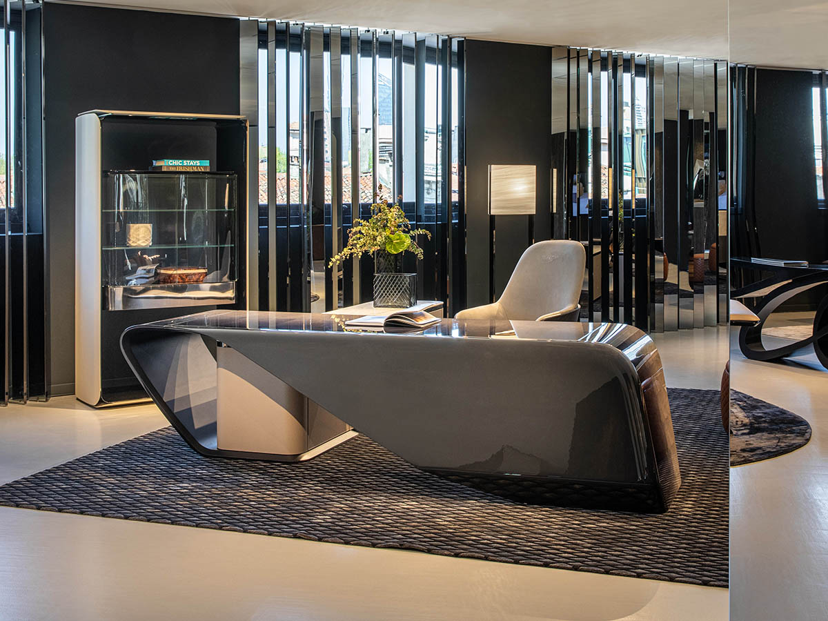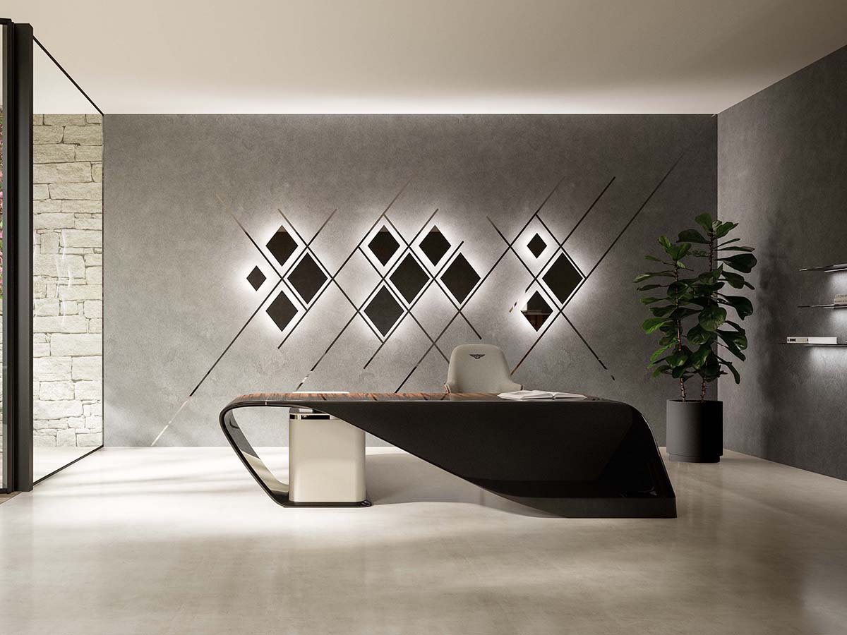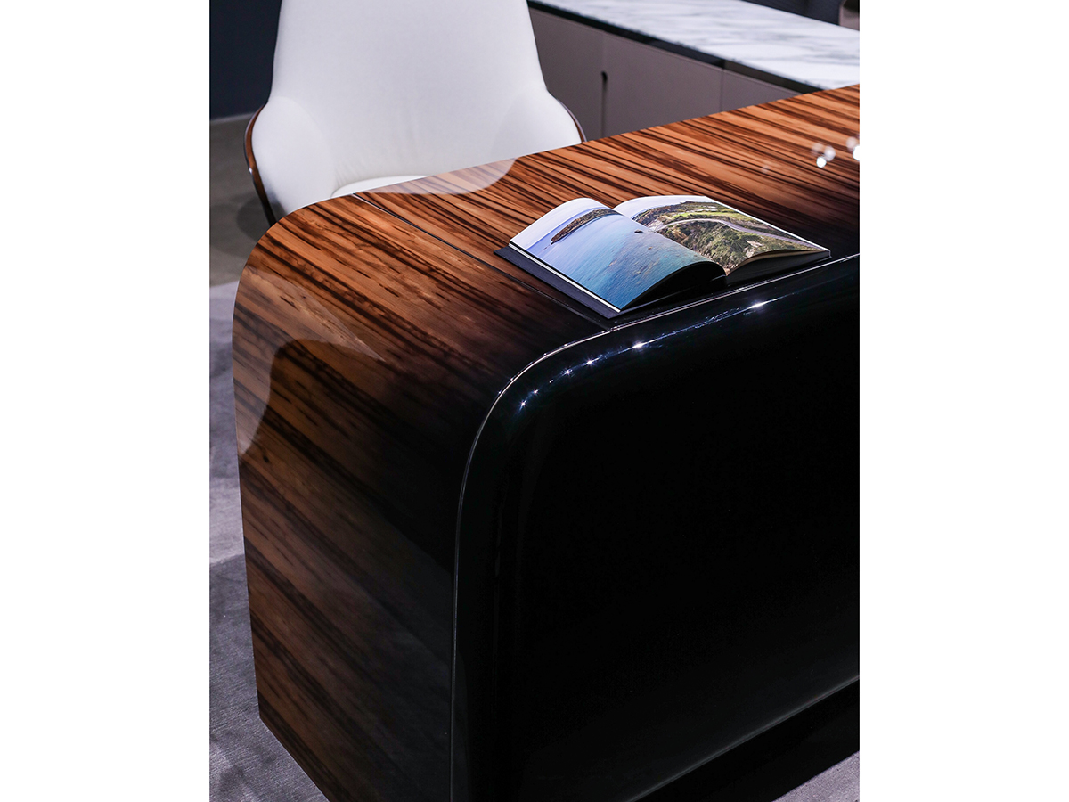 The designer Carlo Colombo designs the Styal desk in collaboration with the Bentley Home team, giving life to an iconic, luxurious and refined product in every detail. The wooden structure, with an original aerodynamic shape, is made up of four elements, divided by a metal profile, which can be upholstered in Vermont leather or veneered in walnut root or other essences, with a glossy brushed finish. An unprecedented degradé lacquered finish is also available on request, which makes the product unique and unrepeatable. The desk interfaces at 90° with a wooden sideboard covered in Vermont leather with metal decoration. The top is available both in wood covered in leather and in Calacatta or Valentine Gray marble.