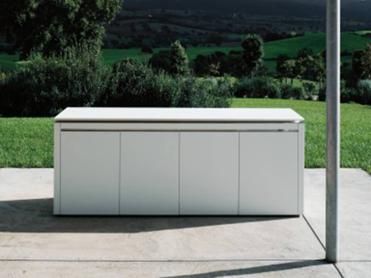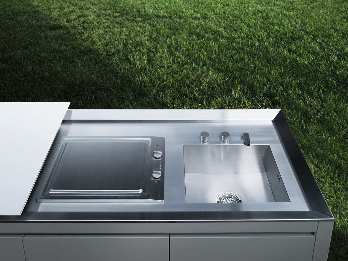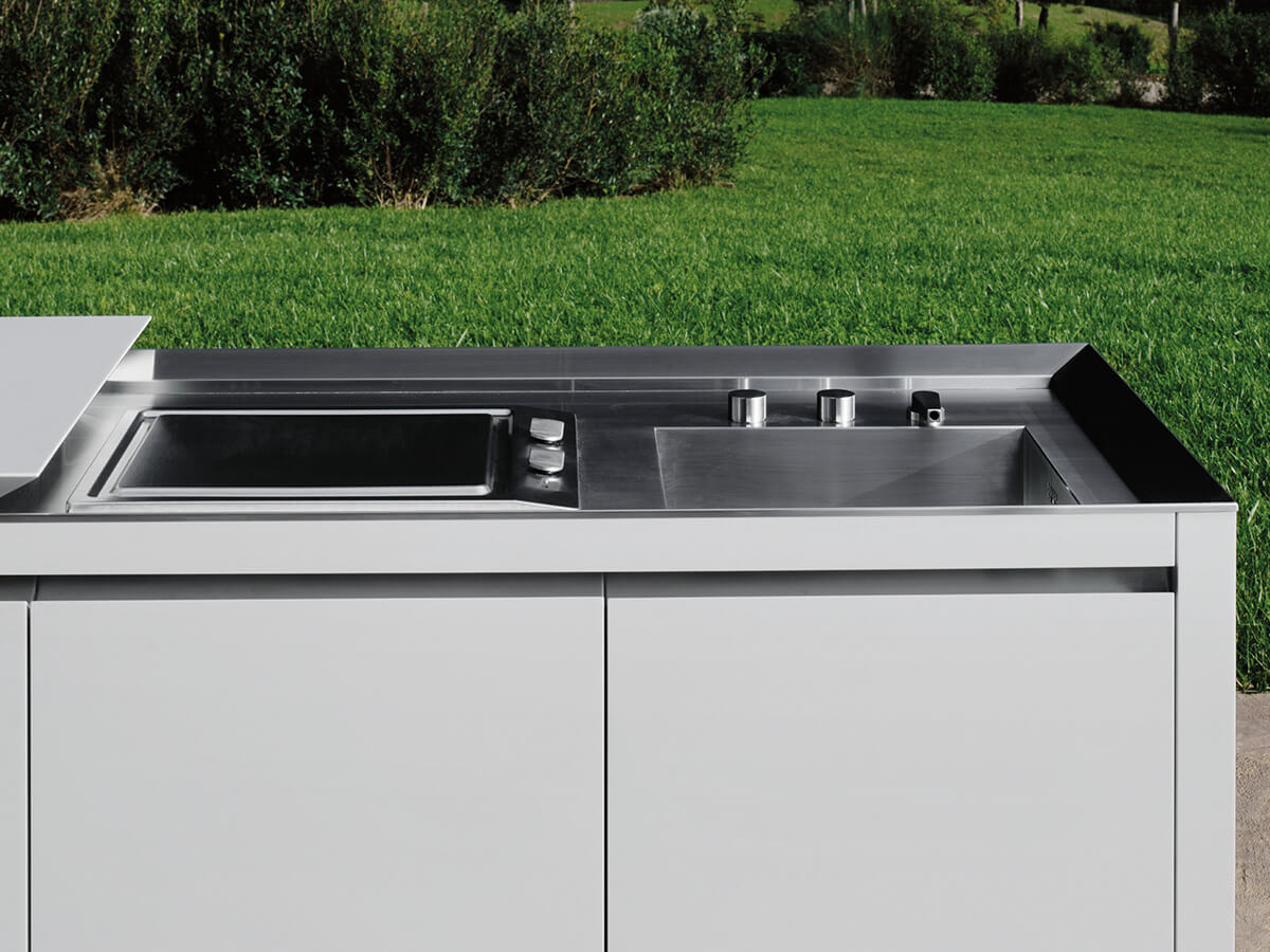 K2 Outdoor by Boffi is a monobloc kitchen suitable for outdoor environments that contains all the elements needed for cooking in a single luxurious island. The top consists of a sliding Corian plate that slides across the long side of the composition to reveal a lower surface dedicated to the cooking and washing areas. In the bases, on the other hand, the oven, refrigerator, dishwasher and containment elements can be housed.The materials in which the kitchen is made make it suitable for open spaces protected by a veranda or a canopy and make it a perfect model for the world of yachting, so much so that it has been used for several years on board the most luxurious models of top brands. band like Sanlorenzo.