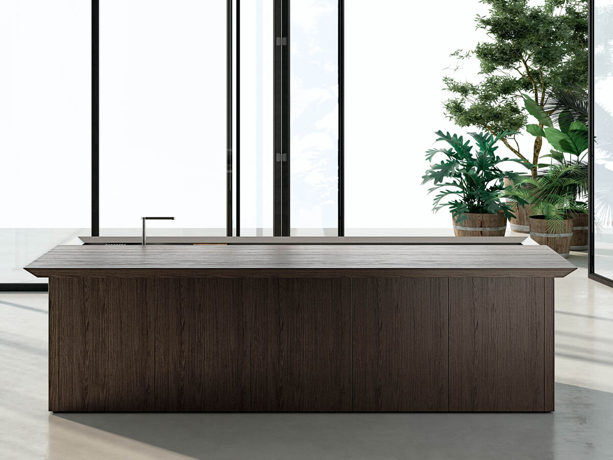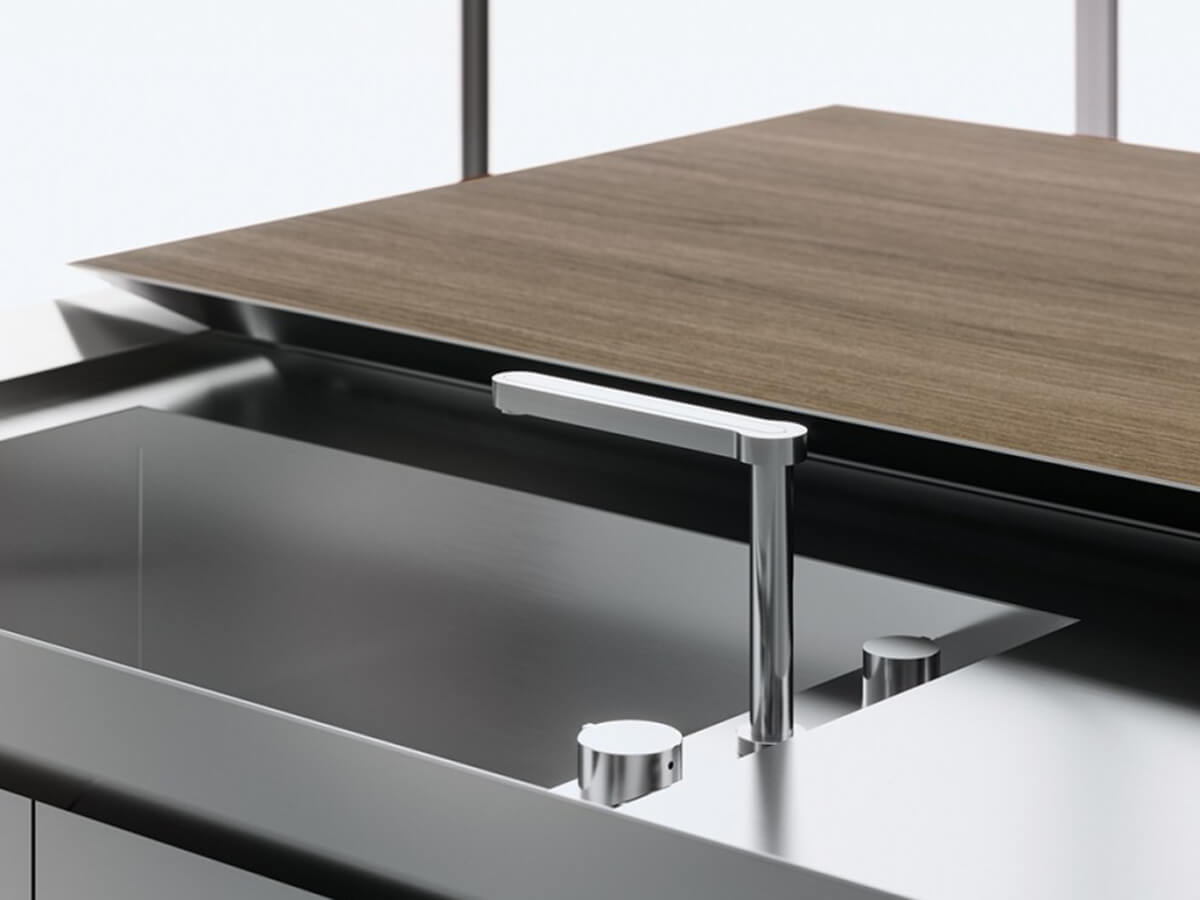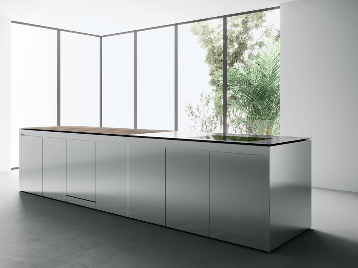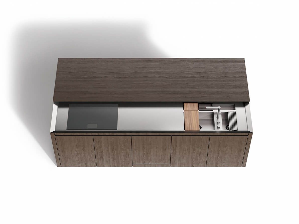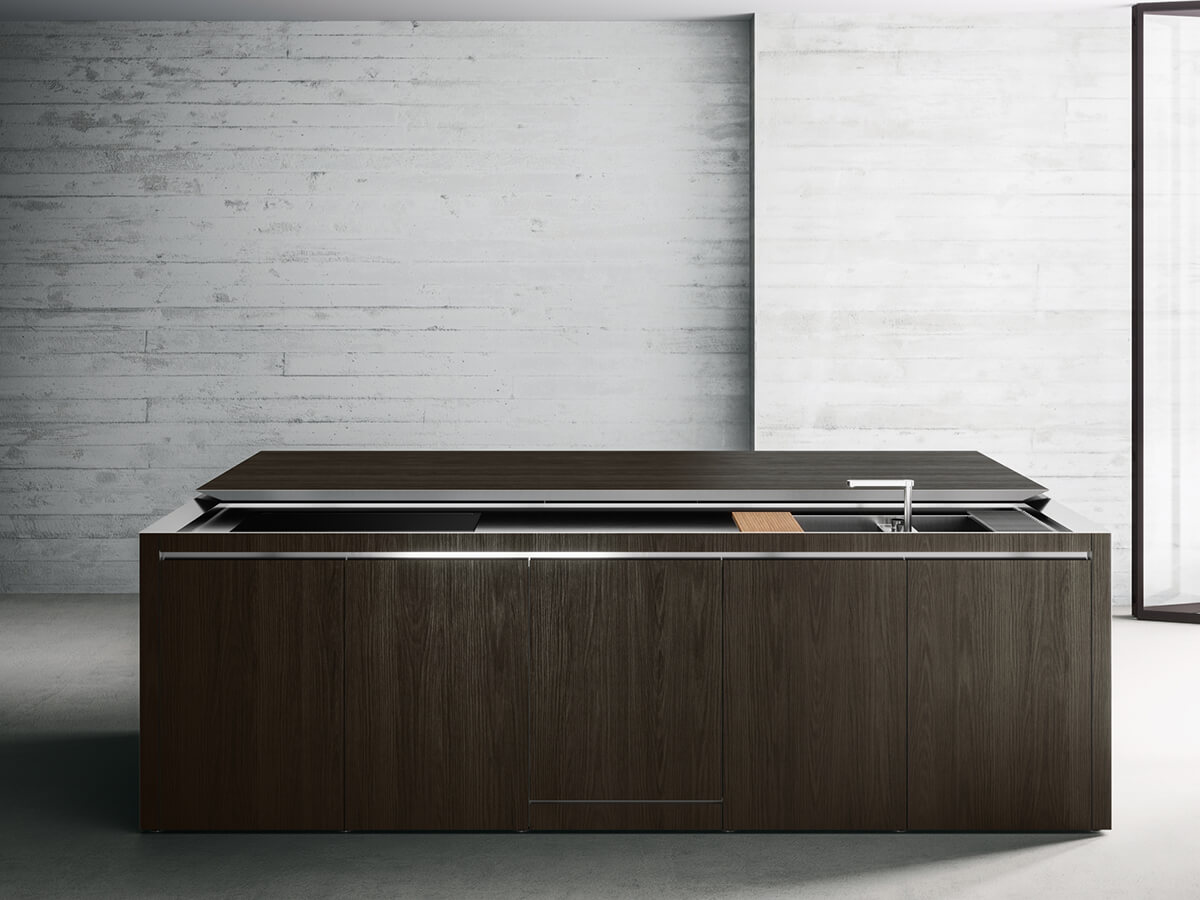 The K6 kitchen by Boffi represents one of the latest examples of Norbert Wangen's experiments on the concept of "cube-kitchen": a monobloc island kitchen with a rigorous monolithic impact in which all the elements of a classic kitchen find their place, designing highly scenographic environments and practical and functional at the same time. The K series kitchens have a closing surface that can hide the work area or open to take on the functions of a snack counter.K6 differs from the other models in the series for the opening of the top that slides deeply through the short side of the block, instead of the long side, making it also suitable for smaller spaces. It is available in two versions: in one, the sliding top covers the entire kitchen top, while in the other it simply hides the washing area, leaving space in the cooking area for a fully retractable stainless steel hood.