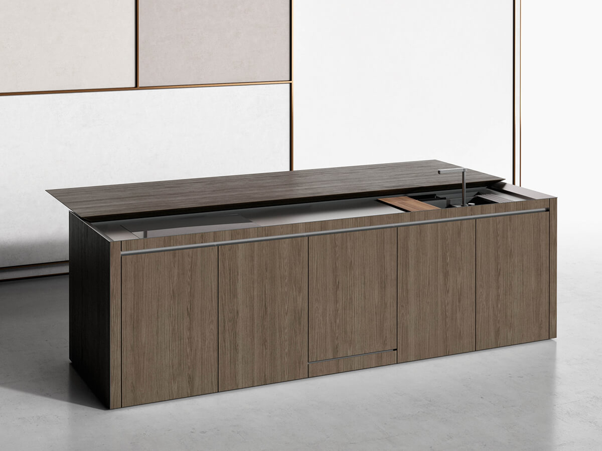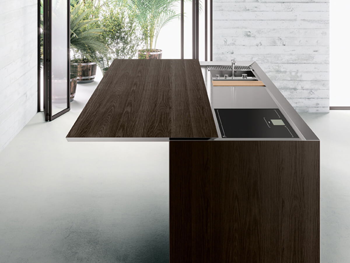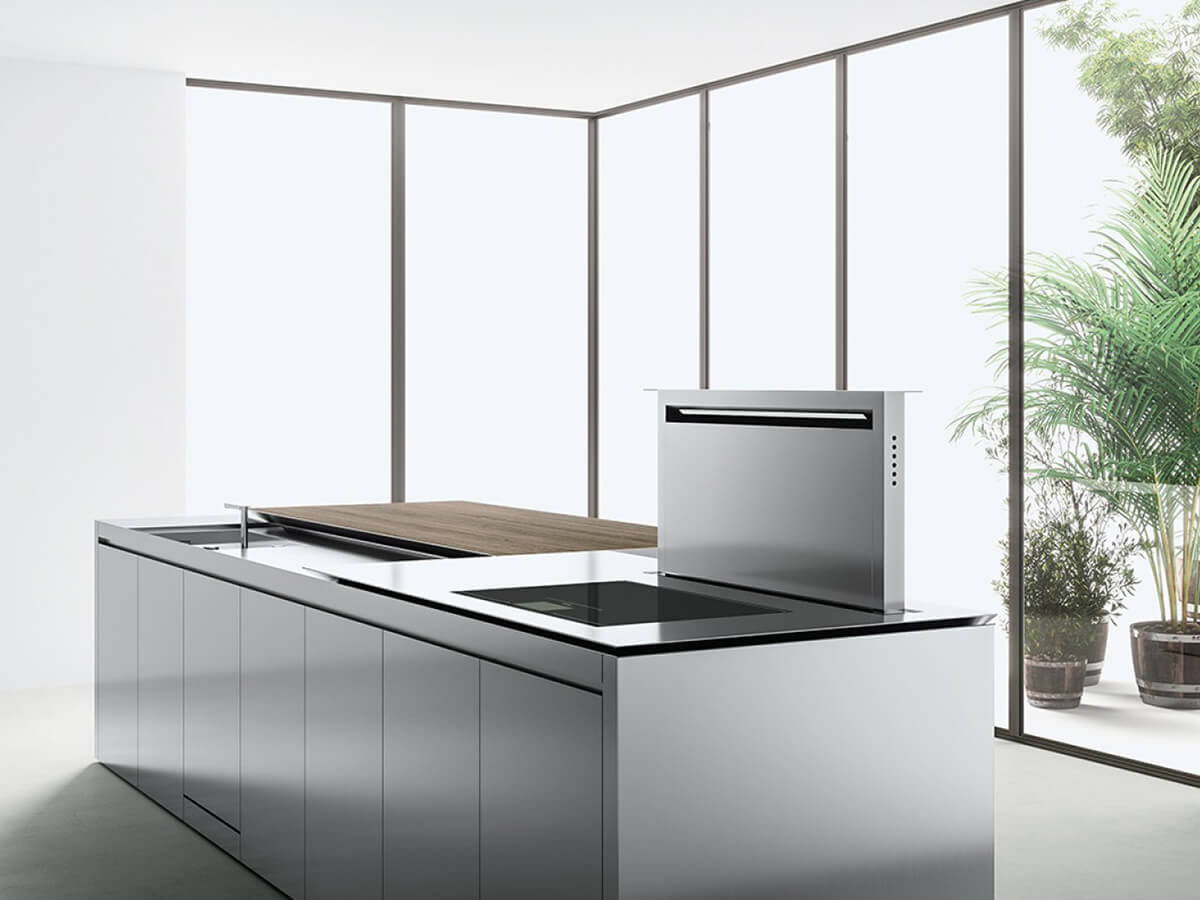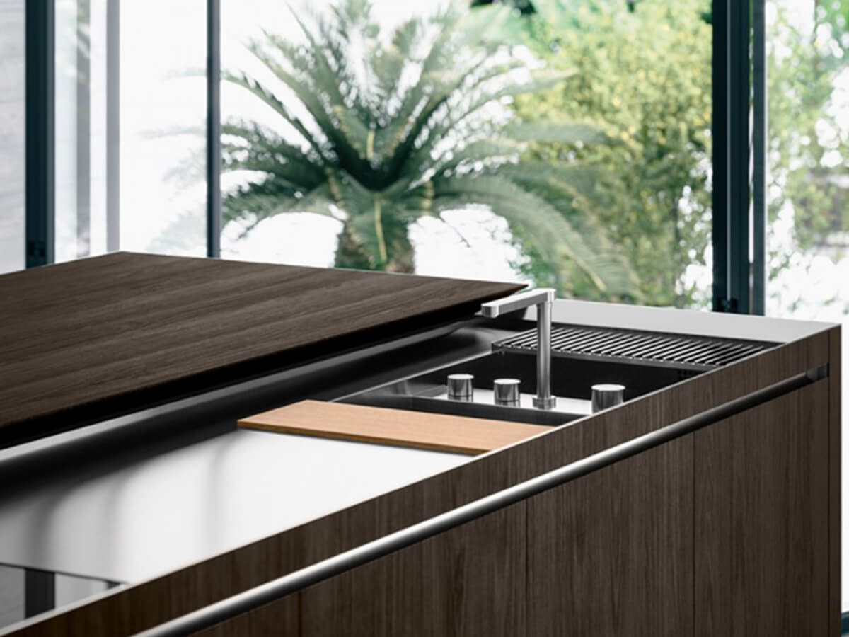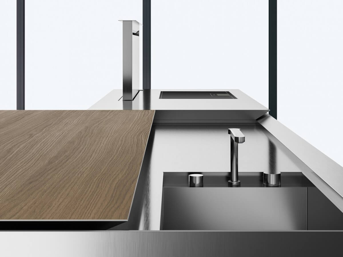 The K6 kitchen by Boffi represents one of the latest examples of Norbert Wangen's experiments on the concept of "cube-kitchen": a monobloc island kitchen with a rigorous monolithic impact in which all the elements of a classic kitchen find their place, designing highly scenographic environments and practical and functional at the same time. The K series kitchens have a closing surface that can hide the work area or open to take on the functions of a snack counter.K6 differs from the other models in the series for the opening of the top that slides deeply through the short side of the block, instead of the long side, making it also suitable for smaller spaces. It is available in two versions: in one, the sliding top covers the entire kitchen top, while in the other it simply hides the washing area, leaving space in the cooking area for a fully retractable stainless steel hood.