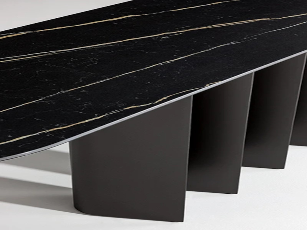 Geometric is a modern console table, oulined by sharp lines and even sharper angles that together create an object with great personality. The console is supported by four drop-shaped legs that, depending on the observation point, can appear soft or hard. This choice expands/increases the compositonal possibilities of Geometric Console, as it projects a different image of itself, according to the placement. This console table is available in a mono-material version made of hand-spatulated clay or in a bi-metric version, with a ceramic or marble top and a wooden base, or with a wooden, ceramic or marble top and a paited aluminium base.