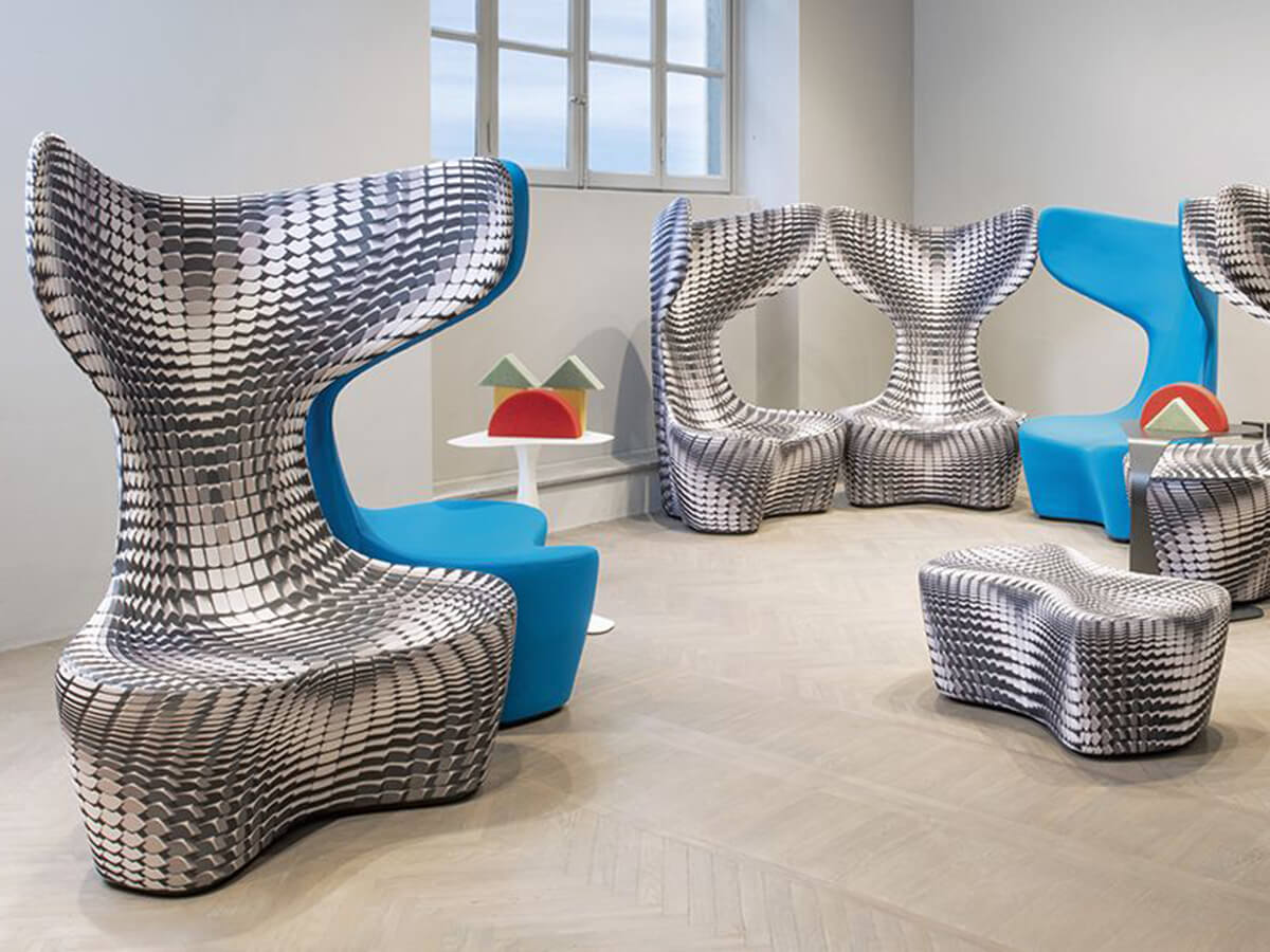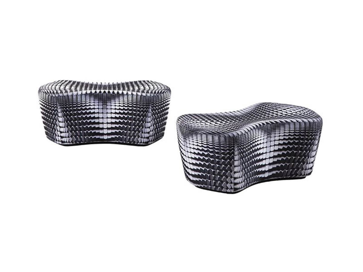 The Drum armchair by Cappellini is one of the most famous and celebrated creations of the eclectic Polish designer Mac Stopa. Its shapes are a tribute to the history of rock n 'roll, and more particularly they are inspired by the unmistakable hexagonal electronic drums characteristic of the 80s. Drum is a very slender vertical armchair, with a high and elongated backrest that culminates in two large ears with the function of headrest. Trial base or feet, it has a compact and sculptural shape that is enhanced in the version covered in a peculiar three-dimensional optical fabric. The Drum collection also includes two poufs of different sizes that can be combined with the armchair with the function of a footrest. Technical features: the L.93.3 cm armchair version is available with a fixed or swivel base; the 106.5 cm version is only available with a fixed base
