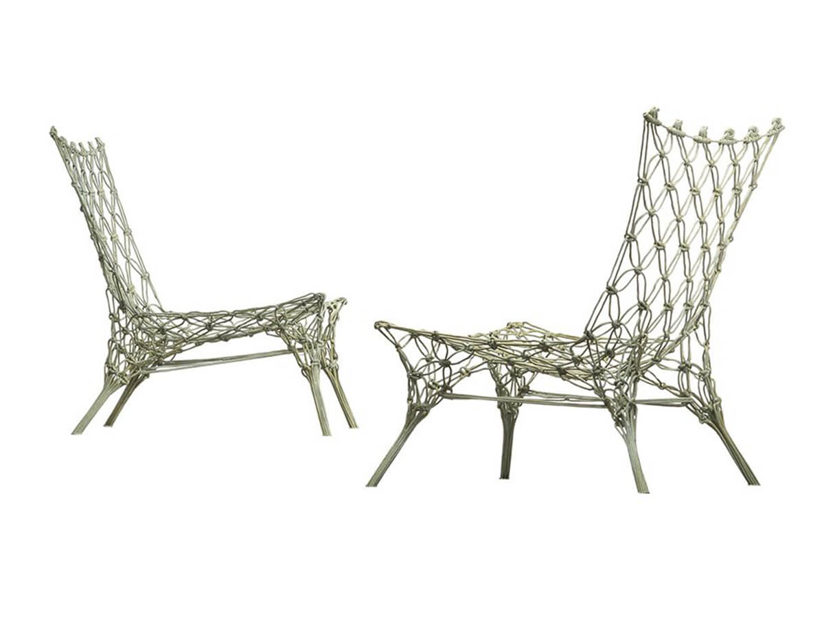 The Knotted Chair represents one of the creations of one of the most famous designers on the international scene today, the Dutch Marcel Wanders. Designed in 1996, originally proposed as part of the experimental collective Droog Design, the Knotted Chair represents an oversized interpretation of the small macramé seats that can still be seen today in dollhouses. A true technical prodigy, this armchair reinterprets the style of macrame in completely different shapes and materials, integrating industrial and artisanal processes: a carbon fiber heart is covered in aramid fiber, molded with traditional techniques to obtain its peculiar interwoven shape, and then made rigid thanks to an epoxy resin treatment. The end result is not just an armchair but a real piece of art, a great masterpiece of 90s design.