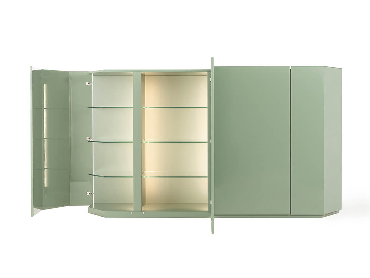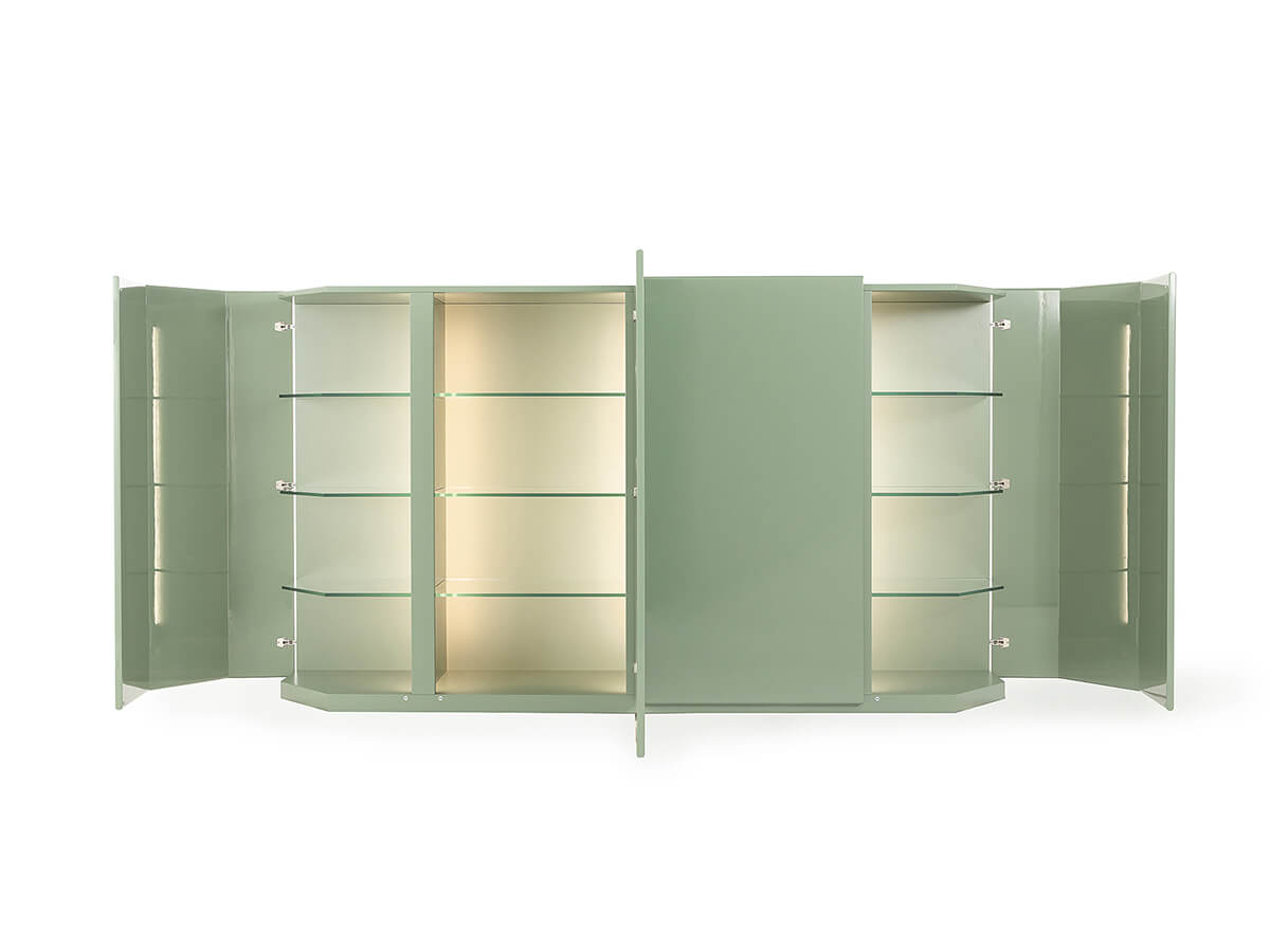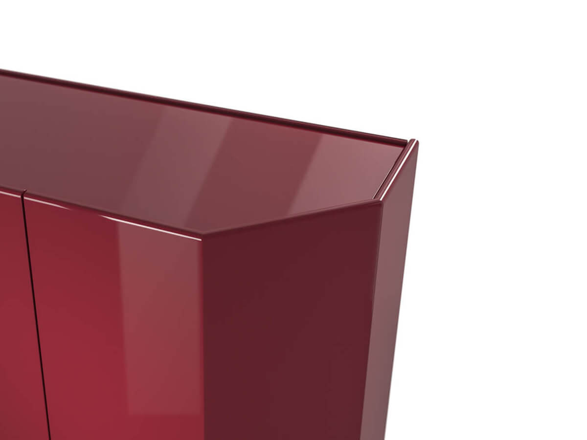 The Bramante sideboard is conceived as a storage unit with extremely modern lines. It has become the symbol of the collection Ultrarazionale by Cassina thanks to the illusory contrast with the classical inspiration – leading Kazuhide Takahama to design the sketch in 1974 – and to the adoption of an ancient technique of industrial lacquering. Bramante stands out in any home areas due to its strong architectural appearance and exceptional versatility, enriched even more after its revision in 2019 which kept unchanged the shape and the sizes, though renovating deeply the building frame by removing the modules. The final result is a more contemporary structure, rich and bright thanks to the new inner Led lighting and continuous glass shelves. The handmade finishings of Bramante enhance the surfaces with several layers of lacquering which highlight its amazing artistic quality and preciousness.