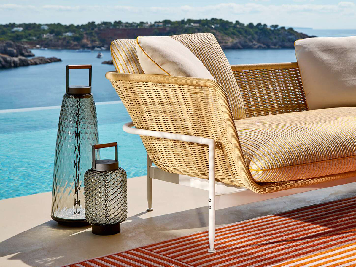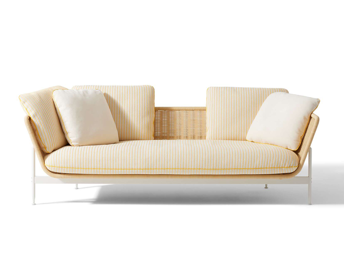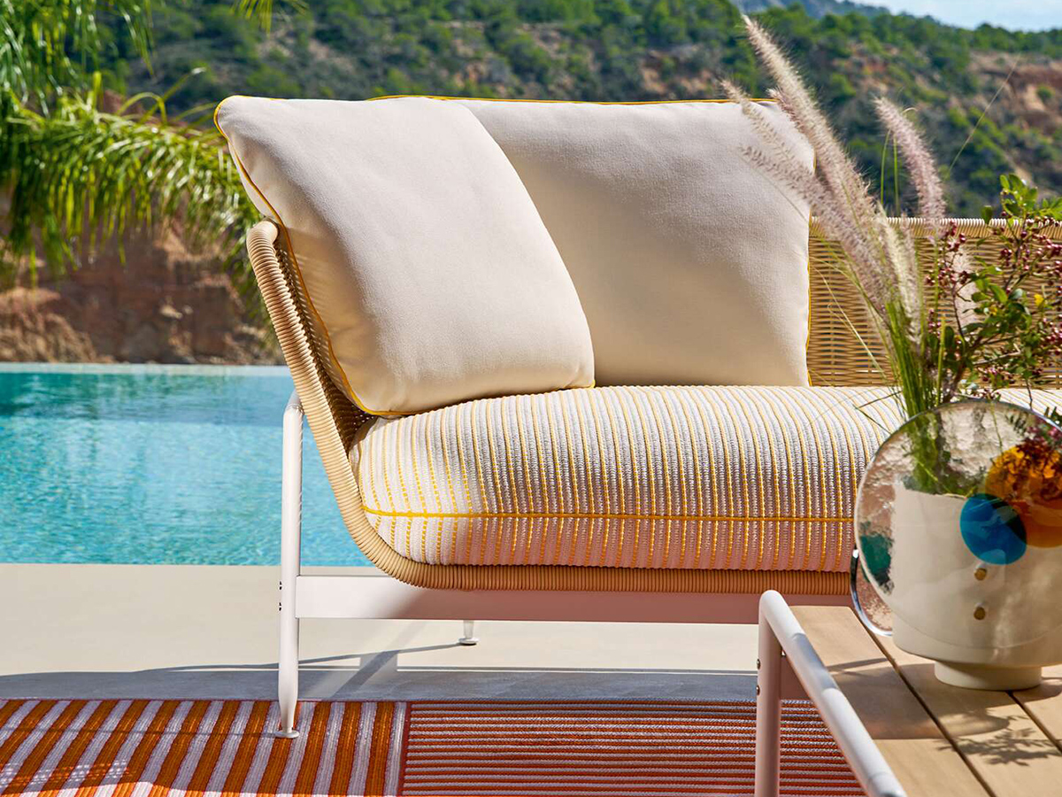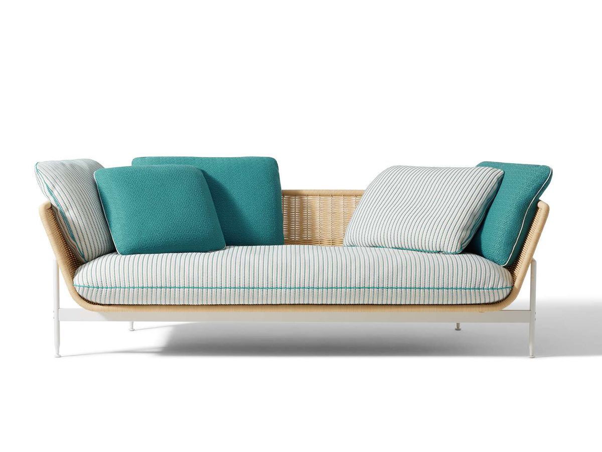 The Esosoft Outdoor sofa by Antonio Citterio is a charming variation of the equally well-known indoor sofa, a celebrated element of the Cassina catalogue. Esosoft draws inspiration from the contrasting materials of the various elements that make up its structure and the hand-woven fibre shell. The basket houses numerous cushions that are expertly placed to improve comfort while sitting and visually fill the structure. The padding is made with lightweight, recycled materials that significantly improve the quality of the furniture as a whole, as well as its resistance in outdoor environments. The range of colours available significantly increases the areas of application of Esosoft, making it extremely versatile.