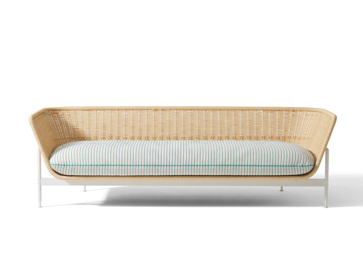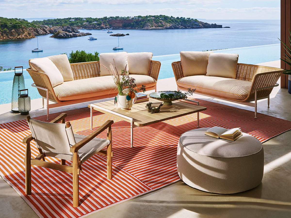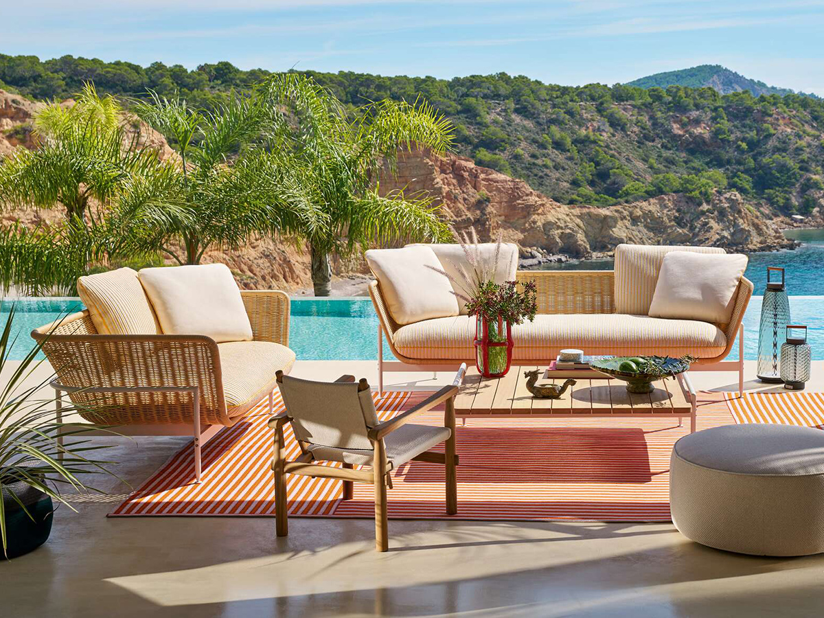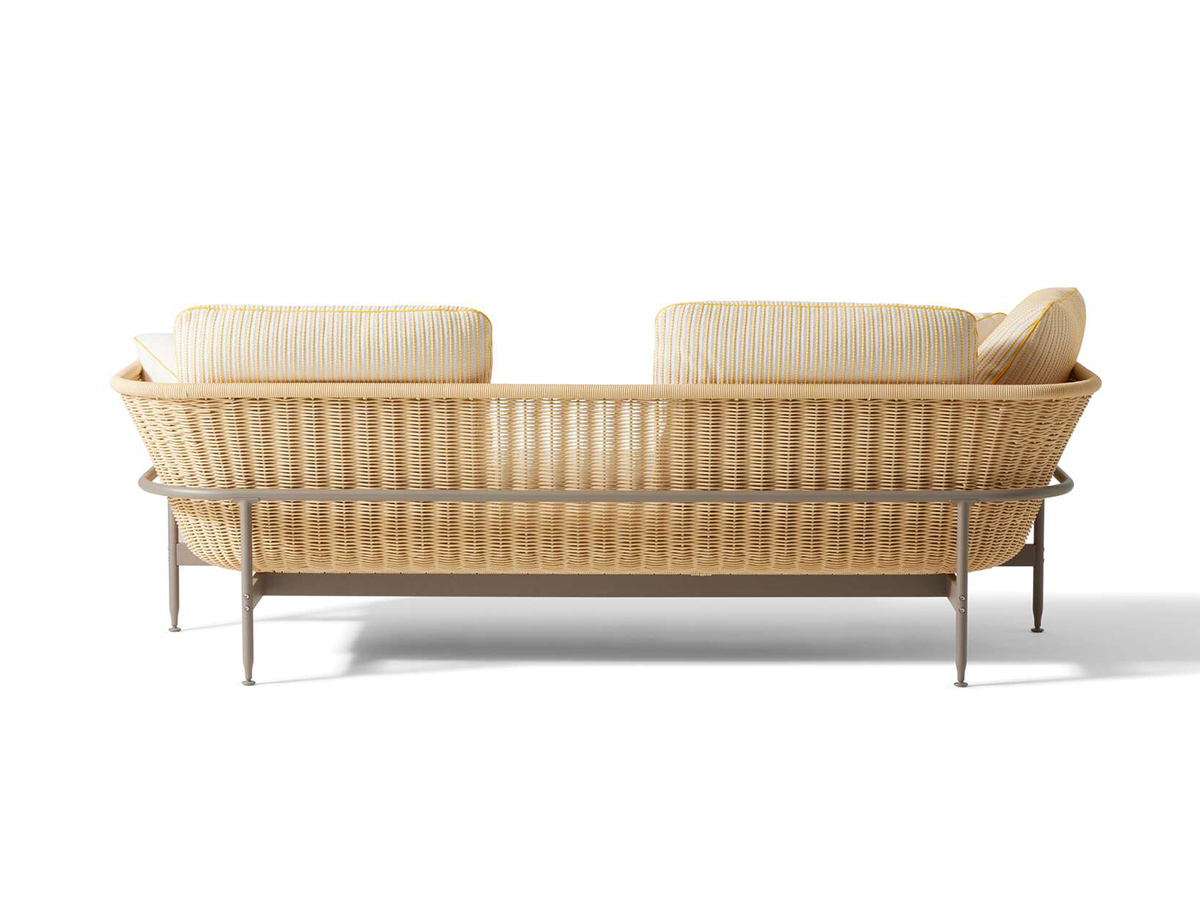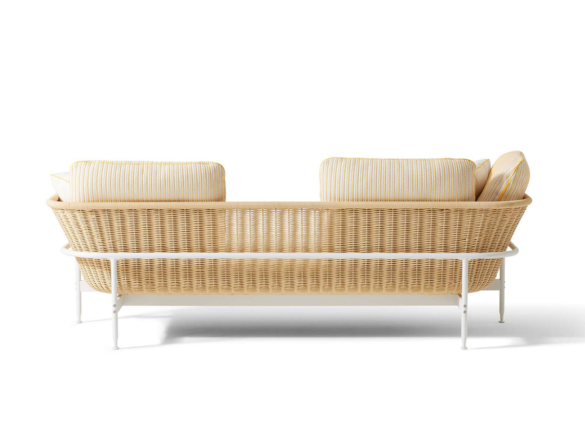 The Esosoft Outdoor sofa by Antonio Citterio is a charming variation of the equally well-known indoor sofa, a celebrated element of the Cassina catalogue. Esosoft draws inspiration from the contrasting materials of the various elements that make up its structure and the hand-woven fibre shell. The basket houses numerous cushions that are expertly placed to improve comfort while sitting and visually fill the structure. The padding is made with lightweight, recycled materials that significantly improve the quality of the furniture as a whole, as well as its resistance in outdoor environments. The range of colours available significantly increases the areas of application of Esosoft, making it extremely versatile.