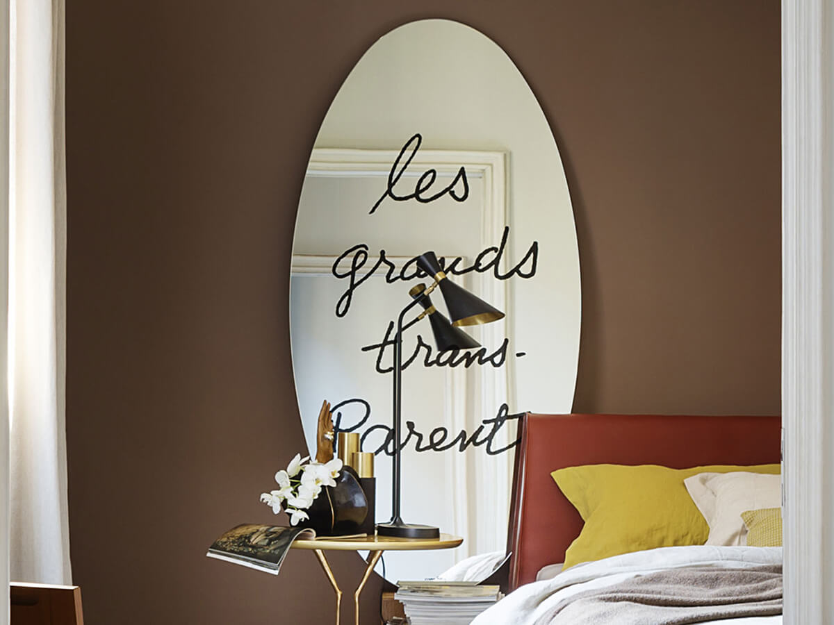 Designed by the histrionic Man Ray whose great passions led him to distinguish himself as a painter, photographer and film-maker at the same time, the mirror Les Grands Transparents manages, like many other works by his creator, to express a radical reference to the Dadaism and Surrealism of the time applied to design of object. The luck of this mirror consists mainly in having associated an extremely original element with the classic shape of the elliptical mirror, that is, an intertwining of words printed on the surface. Les Grands Transparents was produced in series starting from 1971 within Simon's Ultramobile collection and then re-proposed in Cassina's Simon collection. A unique idea, able to amaze and fascinate anyone who wishes to go beyond the conventional.
