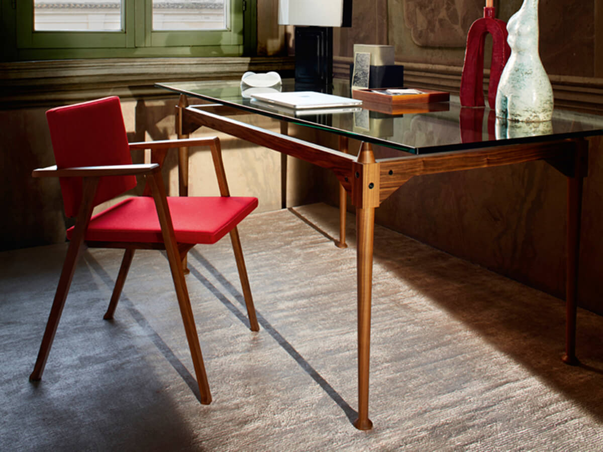 The Luisa Small Armchair is the fruit of Franco Albini’s work and of his poetry “substance in form”. Thanks to his fifteen years long study, the designer managed to create an archetype able to identify the essential elements of the chair and its possible uses at home. After several improving works, his project was realized finally in 1955 through the idea of increasing the thickness of the single wooden elements in the junction points among the parts. After being awarded the Compasso d’Oro ADI prize, Luisa is considered today an extraordinary piece, a worthy representative of the timeless formal synthesis able to combine technique and pure substance.
